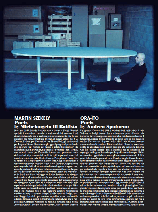 Un giorno d’estate del 1999, i telefoni degli uffici di Vuitton, a Parigi, furono improvvisamente presi d’assalto da numerosi buyer Giapponesi fermamente intenzionati a non lasciarsi sfuggire il futuristico, audace, nuovo modello di zaino, così poco in linea con lo stile tradizionalmente sobrio della maison Francese, di cui avevano trovato un’immagine su un catalogo on-line. Peccato che di questo zaino… alla Vuitton nessuno aveva mai sentito parlare! Trattavasi infatti di una beffa bella e buona, ordita da un giovane studente di design poco più che ventenne di nome Ora-Ïto, sedicente “Design Hacker”, con la passione per la violazione del copyright delle grandi marche per le quali concepiva e addirittura pubblicizzava on-line oggetti… che nessuno gli aveva commissionato! Lungi dal pagar care queste bravate, il giovane pirata del design ne uscì fuori milionario. I dirigenti delle marche prese di mira (oltre a Vuitton anche Swatch, Apple e Levi’s… ), invece di denunciarlo, seppero apprezzare il suo irriverente talento e intuirono che avrebbero fatto migliori affari assoldandolo alle loro dipendenze che denunciandolo. Nasce così uno dei più ricercati, coccolati e ben pagati designer del mondo, come testimoniato dalla folta schiera di clienti illustri (l’Oreal, Heineken, Adidas, Kenzo, Honda, Guerlain, Nike… solo per citarne alcuni) con cui Ora-Ïto, seppur giovanissimo (oggi ha 31 anni), ha già collaborato. Ora che, a quasi dieci anni di distanza da quello zaino immaginario, il suo nome è diventato esso stesso – ironia della sorte – un apprezzato marchio di fama internazionale, cosa ne è di quello spirito provocatore a cui Ora-Ïto deve originariamente la sua fortuna? “Non sono poi così cambiato.” – commenta. “La voglia di stupire e provocare è un tratto saliente del mio carattere che conserverò per tutta la vita, credo. E nonostante il successo internazionale, mi sorprendo ancora, come a diciannove anni, a concepire oggetti immaginari dal design troppo audace perché possano essere messi in produzione. Oggi, tuttavia, ho ben più chiaro il mio obiettivo artistico, ben descritto dal neologismo inglese “simplexity”: ricercare la semplicità senza per questo dover sacrificare la crescente complessità della società contemporanea. Riuscire a concepire oggetti che, a dispetto della complessità delle ricerche che ne hanno preceduto la fabbricazione, trovano proprio nella semplicità del design la loro forza commerciale, equivale per me a mettere a segno la più sottile delle provocazioni”.