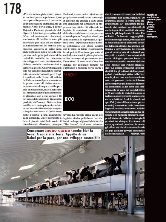 «Per favore, mangiate meno carne!» A lanciare questo appello non è, come si potrebbe pensare, il portavoce di un’associazione animalista, ma un premio Nobel per la pace, il Dr. Rajendra Pachauri, presidente dell’IPCC (il foro intergovernativo sul mutamento climatico dell’ONU), senz’ombra di dubbio la voce più autorevole per tutto ciò che riguarda il riscaldamento del pianeta. Una presenza eccessiva di carne nella dieta costituisce, com’è noto da tempo, una delle principali cause delle cosiddette “malattie del benessere” che affliggono i paesi “ricchi” (obesità, diabete, malattie cardiovascolari e tumore al colon). Una minaccia per la salute ma soprattutto, denuncia Pachauri, per i fragili equilibri del pianeta: «Il settore dell’allevamento figura non solo tra le prime cause di disboscamento, inquinamento di acque e suoli e perdita di biodiversità, ma è anche uno dei principali agenti del cambiamento climatico, con a suo carico il 18% delle emissioni di gas-serra prodotte dall’Uomo». Dati impressionanti, se si considera che neanche il tanto demonizzato settore dei trasporti riesce a inquinare tanto. «L’unica soluzione possibile è una contrazione della domanda. Chi è interessato a dare il proprio contributo alla lotta contro il riscaldamento climatico», prosegue Pachauri «trova nella riduzione del proprio consumo di carne la strategia in assoluto più efficace e dagli effetti più immediati per abbassare la propria carbon-print». Di gran lunga più efficiente nel tagliare le emissioni, ad esempio, della ben più pubblicizzata “dieta a km 0”, ottenuta restringendo (faticosamente) l’acquisto ai soli prodotti regionali1. E soprattutto, e questo è forse l’aspetto più degno di essere sottolineato, con effetti tangibili per il clima già nel giro di pochi anni, poiché il metano (un micidiale gas-serra di cui l’allevamento è il primo produttore) ha un tempo di permanenza nell’atmosfera di solo otto anni, a fronte degli oltre cento necessari per smaltire la CO2. Cosa fare dunque per coniugare rispetto per l’ambiente e passione per la carne a tavola? La risposta arriva da un dettagliato studio pubblicato recentemente sulla prestigiosa rivista medica Lancet2 , i cui autori calcolano che il consumo di carne, per definirsi sostenibile, non debba superare i 90 g al giorno (a fronte degli impressionanti 224 g al giorno consumati mediamente dai carnivori occidentali), di cui non più di 50 g costituiti da carne rossa, la più inquinante di tutte. Un obiettivo facilmente raggiungibile, sottolineano gli autori, introducendo la sana abitudine di eliminare la carne dal menu almeno due dì a settimana e privilegiando, nei restanti giorni, carni a minori emissioni, come il pollo e il maiale. I consumatori di carne biologica possono lavarsi la coscienza e sentirsi esentati dal vincolo morale dei “Ninety-grams-a-day”? La doccia fredda per i più irriducibili tra gli estimatori di carpacci, gulash e hamburger arriva dalla Germania, dove uno studio commissionato dal governo Tedesco3 rivela che il biologico comporta una notevole riduzione di emissioni di gas-serra solo limitatamente al caso dei vegetali (fino al 55% in meno), ma poco o nulla se ad essere presi in esame sono carne e latticini. Anzi, in alcuni casi specifici (carne di bue e toro, ad es.) le emissioni della carne biologica si rivelano a sorpresa addirittura superiori a quella ottenuta con tecniche intensive. Indipendentemente dalla metodologia di produzione dunque, il consumo di carne, quando si prende in esame gli effetti sul riscaldamento climatico, può definirsi davvero sostenibile solo se moderato.