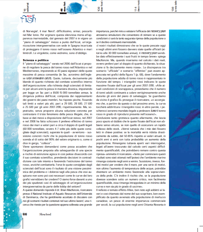 Il “piano di salvataggio” varato nel 2006 dall’ICCAT si propone di regolare la pesca del tonno rosso nell’Oceano Atlantico e nel Mediterraneo imponendo ai paesi signatari delle quote massime di pesca consentita (le TAC, acronimo dell’inglese Total allowable catch). Quote tuttavia decisamente più blande di quanto richiesto dal comitato scientifico interno dell’organizzazione: alla richiesta degli scienziati di limitare per alcuni anni la pesca in maniera drastica, imponendo per legge un TAC pari a 8.500-15.000 tonnellate annue, la dirigenza politica dell’ICCAT ha risposto picche fissando tali limiti a valori decisamente più alti, pari a 29.500, 28.500, 27.500 e 25.500 per gli anni 2007-2010 rispettivamente. Ma, soprattutto, senza proporre alcuna soluzione concreta per contrastare il triste fenomeno della pesca illegale, che, in base ai dati messi a disposizione dall’ICCAT stesso, nel 2007 e nel 2008 ha fatto schizzare il prelievo effettivo di tonno rosso dai mari a valori pari a circa il doppio di quelli legali (~60.000 tonnellate) ovvero 4-7 volte superiori alle quote consigliate dagli scienziati. Superate le quali, essi avvertono, sussistono concreti rischi che la popolazione di tonno rosso scenda al di sotto del 90% del valore originario, o, come si dice in gergo, “collassi”. Viene spontaneo domandarsi come possa accadere che l’organizzazione preposta alla salvaguardia di una specie minacciata di estinzione agisca in così palese disaccordo con il proprio comitato scientifico, prendendo di fatto decisioni che contraddicono spudoratamente tale intento, favorendo tale estinzione invece che combatterla. Forse che le quote consigliate dagli scienziati dell’ICCAT sono il risultato di una visione particolarmente pessimistica del problema e che i dolorosi tagli alla pesca che essi auspicano non sono poi così necessari come le curve dei loro grafici vorrebbero far credere? O siamo forse davanti ad uno dei più spudorati casi di sabotaggio di un’organizzazione intergovernativa da parte delle lobby del settore? A queste domande risponde il Dr. Brian MacKenzie, ricercatore presso il National Institute of Aquatic Resources dell’Università Tecnica di Danimarca, che gentilmente ha accettato di rivelare a SLOWFOOD gli scottanti risultati contenuti suo ultimo lavoro “Impending collapse of bluefin tuna in the northeast Atlantic and Mediterranean”, prima della sua pubblicazione. Una ricerca scientifica che riveste per la questione appena sollevata una grande importanza, perché mira a valutare l’efficacia del Recovery Plan attraverso simulazioni che consentono di stimare se a queste condizioni ci sarà la tanto augurata ripresa della popolazione oppure se il declino continuerà inarrestabile. «I nostri risultati dimostrano che se le quote pescate oggi e negli ultimi anni fossero davvero state quelle ufficiali (attorno alle 30 000 ton annue), il rescue plan avrebbe dato effettivamente i suoi frutti in tempo breve”, spiega McKenzie.” Ma quando inseriamo nel calcolo i dati reali, ovvero prelievi pari al doppio di quanto dichiarato, la situazione si fa decisamente meno rosea». La discrepanza tra scenario “ufficiale” e scenario “effettivo” può essere apprezzata nei grafici di Fig1, dove l’andamento della popolazione adulta di tonno rosso è rappresentato in funzione del tempo. In entrambi i grafici i triangolini rossi indicano le quote massime fissate dall’ICCAT per gli anni 2007-2010. “In entrambi i casi la popolazione cala vertiginosamente nei primi anni del piano di salvataggio. Se guardiamo da vicino il grafico B”, prosegue il ricercatore, “ci accorgiamo che a partire da questo o dal prossimo anno, la curva toccherà i triangolini rossi; in altre parole, i pescherecci avranno mandato legale a prelevare tutto il tonno rosso presente nell’oceano!” . Conclusione tanto assurda quanto allarmante, che lascia poco spazio al dubbio che le quote fissate dall’ICCAT non abbiano senso alcuno, se non quello di assicurare un rapido collasso dello stock. «Vorrei tuttavia che i mie dati venissero letti in chiave positiva: se la mortalità verrà ridotta fin da subito drasticamente, del 50-85% rispetto ai valori attuali, nel giro di pochi anni si avrà con tutta probabilità un aumento della popolazione». Chi tende invece a vedere il bicchiere mezzo vuoto noterà nel grafico B una curva tratteggiata che striscia minacciosamente verso il basso, che sta a indicare una probabilità non nulla, inferiore al 5%, che la popolazione di tonno rosso collasserà a breve. «Rimangono in effetti ancora irrisolti gli interrogativi, legati all’aver trascurato dal calcolo certi parametri difficilmente quantificabili», ammette l’autore. «Tanto per comnciare questi risulati sono stati ottenuti nell’ipotesi che l’ambiente marino rimanga costante negli anni a venire. Sussistono invece fondati motivi per credere che il mare, per una serie di motivi, non per ultimo l’aumento di temperatura delle acque, potrebbe diventare un ambiente meno favorevole alla sopravvivenza della prole. C’è inoltre il rischio che se la popolazione dovesse scendere sotto un numero critico, non facilmente quantificabile, essa rimanga intrappolata in un minimo della curva, e non sia più ingrado di uscirne fuori.» Il nefasto effetto Allee, ben noto agli addetti ai lavori e così chiamato dal nome del suo scopritore, ben esemplificato da quanto avvenuto alla popolazione di merluzzo Canadese, un pesce di enorme importanza commerciale per secoli, la cui popolazione negli anni ‘80-’90 è scesa a livelli bassissimi, oltre il punto di “non-ritorno”: nonostante da oltre quindici anni la pesca al merluzzo canadese sia vietata, la popolazione non accenna ad aumentare. Un triste precedente che dovrebbe fungere da monito per i dirigenti dell’ICCAT .