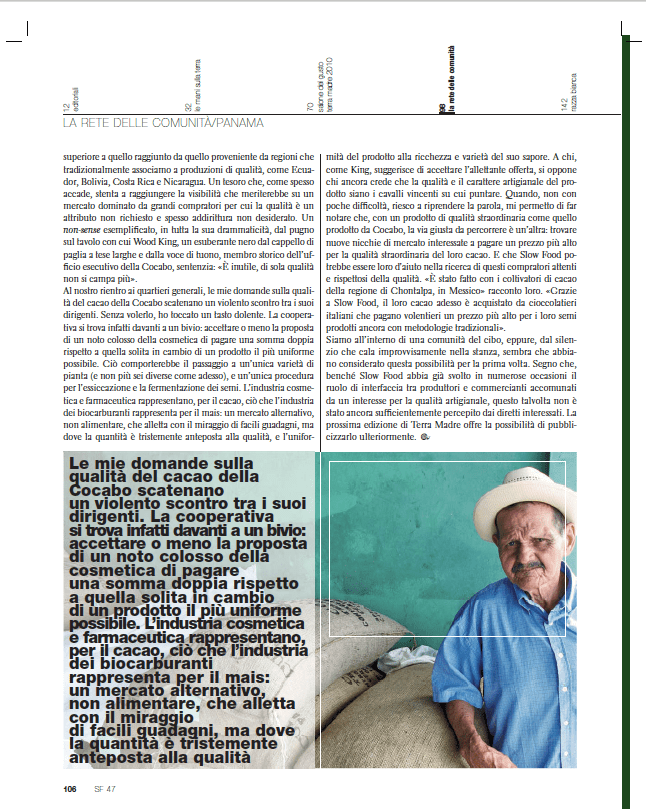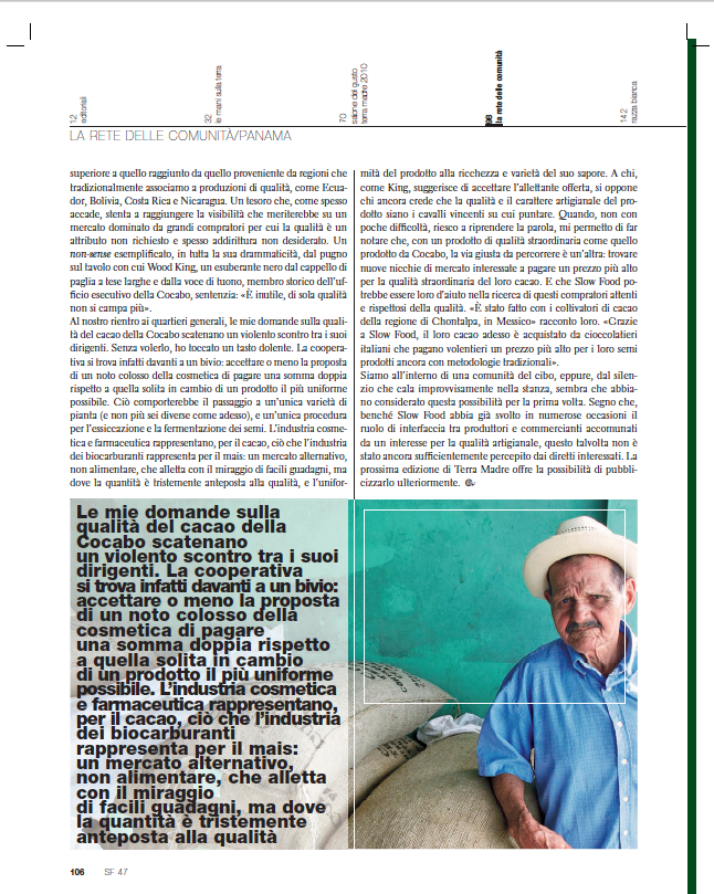 Per gli indios Kuna di Panama, il cioccolato rappresenta una vera e propria ossessione. Per molti di loro, berne fino a quaranta tazze a settimana è la normalità, e se ne conoscono addirittura alcuni che nel corso della loro vita non hanno bevuto altro, a parte l’acqua. Un paio di anni fa gli scienziati hanno messo per la prima volta in correlazione questa loro amara usanza con un fatto davvero sorprendente: i Kuna godono della pressione arteriosa più bassa al mondo, al punto da essere immuni, o quasi, da ictus e da gran parte di quei disturbi del sistema cardiovascolare che flagellano l’Occidente. Eppure a Panama il cacao stenta ad essere riconosciuto come un motivo di orgoglio nazionale: nei libri di geografia delle scuole, ad esempio, raramente lo si menziona tra le principali colture del paese; probabilmente per un retaggio culturale del periodo in cui il paese era governato dalla classe dei grandi proprietari terrieri, per i quali il cacao costituiva una coltura povera, praticata in massima parte dalle popolazioni indigene. A torto, perché quelle che crescono in territorio panamense, sono, a detta di molti, tra le varietà di cacao più pregiate al mondo: Il livello di purezza del cacao prodotto nell’istmo è solitamente pari all’80%, un valore superiore a quello raggiunto dal cacao proveniente da regioni che tradizionalmente associamo a produzioni di qualità, come ad esempio l’Ecuador, la Bolivia, il Costa Rica e il Nicaragua. Un tesoro che, come spesso accade, stenta a raggiungere la visibilità che meriterebbe in un mercato dominato da grandi compratori per cui la qualità è un attributo non richiesto e spesso addirittura non desiderato. Un non-sense esemplificato, in tutta la sua drammaticità, dal pugno sul tavolo con cui il Sig. Wood King , un esuberante nero dal cappello di paglia a tese larghe e dalla voce di tuono, membro storico dell’ufficio esecutivo della Cocabo, introduce una frase rassegnata e pesante come la pietra: “È inutile, di sola qualità non si campa più”. Al nostro rientro ai quartieri generali – dove il ticchettio delle tastiere dei computer ed il ronzio dei ventilatori sono interrotti, di tanto in tanto, dal rumore dei semi di cacao versati fuori dai sacchi per le analisi – , le mie domande sulla qualità del cacao della Cocabo scatenano, con mio stupore, un violento scontro tra i suoi dirigenti. Senza volerlo, ho toccato un tasto dolente. La cooperativa si trova infatti davanti ad un bivio: accettare o meno la proposta di un noto colosso della cosmetica di pagare una somma doppia rispetto a quella solita in cambio di un prodotto il più uniforme possibile. Ciò comporterebbe il passaggio ad un’unica varietà di pianta (e non più sei diverse come adesso), ed un’unica procedura per l’essiccazione e la fermentazione dei semi. L’industria cosmetica e farmaceutica rappresentano, per il cacao, quello che l’industria dei biocarburanti rappresenta per il mais: un mercato alternativo, non alimentare, che alletta con il miraggio di facili guadagni, ma dove la quantità è tristemente anteposta alla qualità, e l’uniformità del prodotto alla ricchezza e varietà del suo sapore. A chi, come il Sig. King, suggerisce, seppur a malincuore, di accettare l’allettante offerta, si oppone strenuamente chi ancora crede che la qualità ed il carattere artigianale del prodotto siano i cavalli vincenti su cui puntare. Quando, non con poche difficoltà, riesco a riprendere la parola, mi permetto di far notare che, con un prodotto di qualità straordinaria come quello prodotto da Cocabo, la via giusta da percorrere è certamente un’altra: trovare nuove nicchie di mercato interessate a pagare un prezzo più alto per la qualità straordinaria del loro cacao. E che Slow Food potrebbe essere loro d’aiuto nella ricerca di questi compratori attenti e rispettosi della qualità. “È stato fatto ad esempio con i coltivatori di cacao della regione di Chontapla, in Messico”, racconto loro. “Grazie a Slow Food, il loro cacao adesso è acquistato da cioccolatieri Italiani che pagano volentieri un prezzo più alto per i loro semi prodotti ancora con metodologie tradizionali.” Siamo all’interno di una comunità del cibo , eppure, dal silenzio che improvvisamente scende nella stanza, e dallo sguardo attonito con cui tutti improvvisamente prendono ad osservarmi, sembra che abbiano pensato a questa possibilità per la prima volta. Segno che, nonostante Slow Food abbia già svolto in numerose occasioni il ruolo di interfaccia tra produttori e commercianti accomunati da un interesse per la qualità artigianale, questo suo ruolo di mediatore non è stato ancora sufficientemente percepito dai diretti interessati, persino in seno alla sua propria rete. La prossima edizione di Terra Madre offre la possibilità di pubblicizzarlo ulteriormente. Non c’è, del resto, molto tempo da perdere. Come farfalle rare, le nicchie della qualità – sia di produttori che di compratori – hanno problemi a trovarsi ed accoppiarsi. Se non si agisce in tempo, rischiano di morire di solitudine.