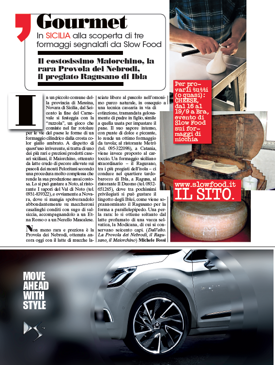 Vi è un piccolo comune della provincia di Messina, Novara di Sicilia, dove dal Seicento la fine del Carnevale si festeggia col gioco della “ruzzola”, che consiste nel far rotolare per le vie del paese le forme di un formaggio di forma cilindrica dalla crosta color giallo ambrato. A dispetto dell’uso irriverente che se ne fa in quel giorno di festa, si tratta di uno dei più rari e preziosi prodotti caseari siciliani: il “Maiorchino”. Lo si ottiene da latte crudo di pecore allevate sui pascoli dei monti Peloritani seguendo una procedura molto complessa, che rende la sua produzione molto costosa. Lo si può gustare durante una visita nella perla del Barocco Siciliano, Noto, al ristorante “I sapori del val di Noto” (Tel. 0931 839322), e ovviamente a Novara, dove si mangia spolverandolo abbondantemente su maccheroni casalinghi conditi con sugo di salsiccia, accompagnandolo ad un Etna Rosso o un Nerello Mascalese. Non meno rara e preziosa è la “Provola del Nebrodi”, ottenuta ancora oggi con il latte di mucche lasciate libere al pascolo nell’omonimo parco naturale, in ossequio di una tecnica casearia in via di scomparsa, tramandata gelosamente da padre a figlio, simile a quella usata per impastare il pane. Il suo sapore intenso, con punte di dolce e piccante, lo rende un ottimo formaggio da tavola; al ristorante Metrò, a Catania (Tel. 095 322098) viene invece proposto al cartoccio. Un terzo formaggio siciliano straordinario, il “ragusano”, ci conduce infine tra lo splendore tardo-barocco del quartiere di Ibla, a Ragusa, al ristorante “il Duomo” (Tel: 0932 651265). Qui si può essere tra i pochi privilegiati a gustare il “lingotto degli Iblei”, come il “ragusano” è anche soprannominato per la tipica forma a parallelepipedo delle sue forme. Una perla rara: lo si ottiene infatti solo dal latte di una vacca selvatica, la Modicana, di cui si conservano solo 600 capi, che vive brada tutto l’anno, producendo un latte profumatissimo.