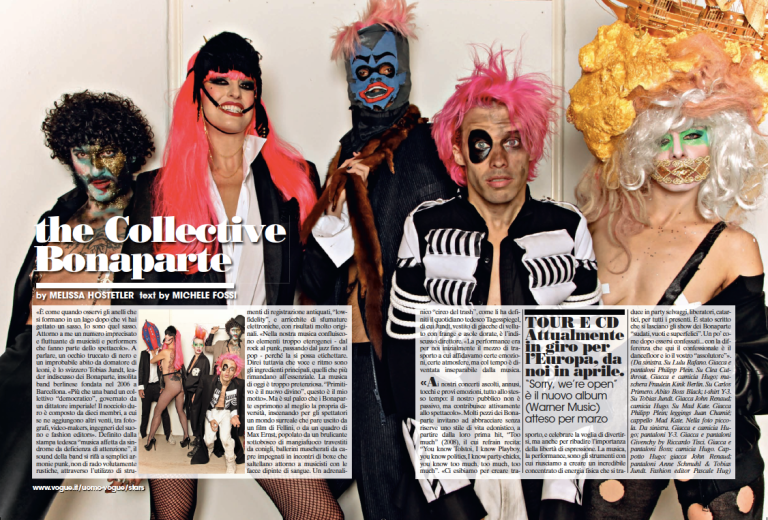 «È come quando osservi gli anelli che si formano in un lago dopo che vi hai gettato un sasso. Io sono quel sasso. Attorno a me si è venuto a formare un gruppo di persone, che, più o meno sporadicamente, prendono parte, sia nella veste di musicisti che di performer, ai nostri spettacoli». A parlare, un occhio truccato di nero ed un improbabile abito da domatore di leoni, è lo svizzero Tobias Jundt, leader indiscusso della band Berlinese Bonaparte. Più che una band, Bonaparte è un collettivo di Performer, spiega Tobias Jundt, fondatore e leader indiscusso del gruppo musicale Berlinese, fondato nel 2006 a Barcellona e composto da un numero imprecisato e fluttuante di persone. «Il “nocciolo duro” è composto da dieci membri, a cui se ne aggiungono altre venti, tra fotografi, video-maker, ingegneri del suono e fashion editor, che ci ruotano attorno. La dinamica che ne risulta è quella di un collettivo democratico… governato da un dittatore imperiale!”. Definito dalla stampa tedesca “musica affetta da sindrome da deficienza di attenzione” , il sound della band, soprattutto nell’album di debutto, “Too Much” si rifà a semplici armonie punk, non di rado volutamente rustiche, attraverso l’utilizzo di strumenti di registrazione antiquati, “low-fidelity”, arricchite, soprattutto a partire dal secondo e terzo album, (“Remuched” (2009) e “My Horse likes you” (2010)) di sfumature elettroniche, con risultati molto originali. «Nella nostra musica confluiscono elementi troppo eterogenei, dal rock e dal punk, passando dal jazz fino al pop, perché la si possa etichettare. Direi tuttavia che voce e ritmo sono gli ingredienti principali, quelli che più rimandano all’essenziale. La musica di oggi è troppo pretenziosa. “Primitivo è il nuovo divino”, è il mio motto». Ma è sul palco che i Bonaparte esprimono al meglio la propria “diversità”, inscenando per gli spettatori un mondo surreale che pare uscito da un film di Fellini, o da un quadro di Max Ernst, popolato da un brulicante sottobosco di mangia-fuoco travestiti da conigli, ballerini mascherati da capre impegnati in incontri di boxe che saltellano attorno a musicisti con le facce dipinte di sangue, di straordinario impatto visivo. Un adrenalinico “circo del trash”, come li ha definiti il quotidiano tedesco Tagesspiegel, di cui Jundt, vestito di giacche in velluto con frange e asole dorate, è l’indiscusso direttore. «La performance era per noi inizialmente il mezzo di trasporto a cui affidavamo certe emozioni, atmosfere, ma col tempo è diventata un tutt’uno con il messaggio che trasporta, inseparabile dalla musica. Ai nostri concerti ascolti, annusi, tocchi e provi emozioni, tutto allo stesso tempo: il nostro pubblico non è un mero ascoltatore passivo, ma contribuisce attivamente allo spettacolo». Molti pezzi dei Bonaparte invitano ad abbracciare senza riserve uno stile di vita edonistico, a partire dalla loro prima hit, “Too Much” (2008), il cui refrain recita: “You know Tolstoi, I know Playboy, you know politics, I know party chicks, you know too much, too much… too much”. Loro stessi, in una recente intervista, si sono definiti un “esercito edonista”. «“Party al posto della politica”, o “Party come forma, a tutti gli effetti, di politica?”, signor Jundt?» «Non saprei dire se si tratta o meno di politica ma certamente è una presa di posizione. Ci esibiamo per creare trasporto, e celebrare la voglia di divertirsi, ma anche per ribadire l’importanza della libertà di espressione». «La musica, la performance, sono gli strumenti con cui riusciamo a creare un incredibile concentrato di energia fisica», prosegue l’artista, «che si traduce in party selvaggi, liberatori, catartici, per tutti i presenti. È stato scritto che si lascia gli show dei Bonaparte “sudati, vuoti e superfelici”. Un po’ come dopo essersi confessati… se non che il confessionale è il dancefloor ed io il vostro… “prete della notte”!». Nell’immediato futuro, i Bonaparte saranno impegnati in una trentina di date di un tour Europeo che porterà l’acclamato baraccone circense berlinese a giro per la Germania, l’Austria, la Svizzera, la Francia, la Spagna, il Belgio e l’Olanda. “Per il nostro primo tour Italiano si dovrà attendere Aprile», anticipa Jundt. Pochi mesi prima, a Gennaio è prevista infatti l’uscita in Italia, presso Warner Music”, dell’ultimo album della band, “Sorry we’re open” (2012), che dà anche il nome al tour «È la prima volta che un nostro album viene pubblicato nel vostro paese. Iniziate fin da ora a lucidare le vostre scarpe da ballo», avverte. «Ci sarà da scatenarsi!»