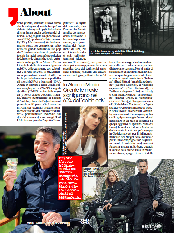 La “benedizione” di un personaggio famoso, si sa, può fare la fortuna di un brand. Charles Worth, “padre” della haute couture, lo aveva già capito nell’800: gli fu sufficiente regalare alcune sue creazioni alla principessa Pauline Von Metternich, personaggio molto in vista alla corte dell’imperatore Napoleone III, per garantire alla sua Maison una visibilità senza precedenti. Anche il “celebrity endorsement”, l’uso di star come testimonial di campagne pubblicitarie, è tutto fuorché un fenomeno recente: basti pensare ai poster pubblicitari che, già nel 1890, ritraggono l’attrice Sarah Bernhardt come volto de “La Diaphane”, una nota marca di cosmetici. Ma è solo a partire dagli anni 80 che il fenomeno ha assunto le proporzioni che ben conosciamo. Nei paesi asiatici si può parlare di una vera e propria ossessione: il celebrity endorsement, secondo il colosso di market research Millward Brown, interessa il 18% delle campagne in India, il 30% in Giappone e addirittura il 35% in Cina, dove può capitare di vedere la stessa star in 15 campagne diverse nello stesso momento. Fino all’anno scorso la cantante e attrice Jolin Tsai, la Jennifer Lopez cinese, figurava ad esempio in ben 14 spot diversi, da Levi’s a MacDonald’s, “anche se la sua capacità di essere credibile per il primo brand” – ebbe a notare a tal riguardo il Financial Times – “è inevitabilmente messa a dura prova da troppo consumo del secondo”. A livello globale, Millward Brown stima che la categoria di celebrities più richiesta dalle agenzie pubblicitarie siano di gran lunga le star del cinema (39%), seguite da quelle televisive (18%), sportive (16%) e musicali (12%). Ma che cosa detta l’orientamento verso, per esempio, un volto noto del grande schermo, o una pop star? La diversa fortuna di queste categorie ha radici geografiche e ricalca fedelmente le dinamiche socio-culturali di un luogo. Se in Africa e Medio Oriente le stelle del cinema figurano nel 60% delle campagne con celebrities e in Asia nel 36%, in Sud America la percentuale scende al 4%, e a far la parte da leone sono soprattutto gli sportivi (34%) e i cantanti (10%). Anche in Europa e negli Usa la palma va agli sportivi (27%-29%), seguiti, a pari merito, da attori (17-19%) e star della musica (9-10%). Spiega Agostino Toscana, creativo pubblicitario di Saatchi & Saatchi, colosso dell’advertisement presente in 84 paesi: «Se è vero che in Asia, ad esempio, prevale nettamente l’aspetto del carisma “seduttivo”», perfettamente incarnato dai divi del cinema di casa, «negli Stati Uniti invece prevale l’aspetto “competitivo”, la figura del vincente, dell’uomo che è stato artefice del suo successo attraverso il lavoro e la perseveranza», una prerogativa dei “supermen” di Nba, Nfl etc. Concentrandoci solo sullo spettacolo “at large” (dunque cinema, Tv e musica), non pare esistere più una mappatura che a una specifica dote del testimonial (attoriale, musicale) colleghi una categoria merceologica piuttosto che un’altra. «Direi che oggi i testimonials vengono scelti per i valori che si portano dietro come persone. Non si tratta di scegliere un attore in quanto attore o in quanto genericamente famoso ma in quanto simbolo di “bellezza” (Brad Pitt), di “morbida seduzione” (George Clooney), di “maschia esperienza” (Clint Eastwood), di “raffinata eleganza” (Adrian Brody o John Malkovich), di “virile eleganza” (Daniel Craig) di “sensibilità” (Richard Gere), di ” trasgressione cool” (Kate Moss, Madonna), di “golosità del vivere e inclinazione ai piaceri della tavola” (Depardieu, Abatantuono) e via così. L’immagine pubblica di ogni “personaggio famoso” si può incasellare in un paio di aggettivi. Se quegli aggettivi si sposano bene col brand la scelta è fatta». «Anche se decisamente in calo un po’ ovunque in Occidente, vuoi per il ridimensionamento dei budget delle aziende e per le tante campagne-flop degli ultimi anni, il celebrity endorsement funziona ancora molto bene quando il talento della star è usato in maniera creativa», spiega Bruno Bertelli, direttore creativo esecutivo di Publicis Italia, divisione italiana del gruppo di comunicazione fondato a Parigi nel 1929, terzo al mondo per giro d’affari. «Un buon esempio è lo spot per la marca di cioccolato Snickers con Joe Pesci, nel quale l’attore è impiegato come tale, e non nella veste di celebrity, per recitare una scena ispirata al suo celebre film “Quei bravi ragazzi”». Incalza Dominique Twose di Millward Brown: «In parte dipende dal messaggio: se quello che si vuole trasmettere è che con il profumo X ci si sentirà bellissime, allora probabilmente si scritturerà una supermodel o un’attrice di raro fascino. Può dipendere anche da certe consuetudini pubblicitarie di carattere regionale/normative regionali di categoria: in alcune aree la regola è di pubblicizzare il makeup usando modelle, in altre si preferiscono le attrici. E, che ci si creda o no, può dipendere anche dal capriccio del team di “admen”: so di casi in cui una certa attrice è stata impiegata solo perché il direttore creativo la voleva conoscere!». Esiste un ambito in cui le star della musica sembrano avere un concreto vantaggio su quelle dello schermo: i social media, dove in quanto a numero di like e followers,” inceneriscono” letteralmente tutte le altre categorie (Un attore à la page come Robert Pattinson non raggiunge i due milioni di like, a fronte dei 65 di Rihanna). Se l’iconica campagna di Mark Wahlberg alias “Marky Mark” per l’underwear di Calvin Klein nel 1992 lanciò l’allora rapper su una traiettoria che ha presto intersecato il big screen, oggi alla voce “music testimonial” furoreggia Kate Perry, protagonista da alcuni mesi di una scanzonata campagna per il brand di patatine Popchips (in cui si dice abbia investito in prima persona), un abbinamento perfetto tra celebrità e prodot