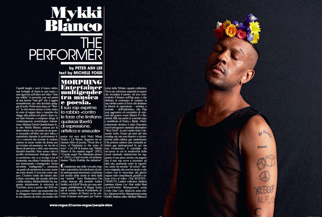 Capelli lunghi e neri, Il trucco sfatto, una bottiglia di rhum in una mano ed una sigaretta nell’altra, nel video “Join my militia” si presenta nei panni di una lasciva “bad girl” che si aggira sensualmente su una desolata spiaggia di notte. Pochi mesi dopo, nel video di “Wavvy” diretto da Francesco Carrozzini, lo ritroviamo invece a torso nudo, in veste di rapper duro e maschio che sfugge alla polizia nel ghetto dopo esser stato beccato a comprar droga. Il poeta/rapper statunitense Michael David Quattlebaum Jr., in arte Mykki Blanco, spiazza per la disinvoltura con cui passa da un genere sessuale all’altro: nei suoi video, e soprattutto durante performance live e concerti, che non di rado lo vedono entrare in scena vestito da donna per poi tornare ad assumere, via via che si libera di parrucca ed abiti, una marcata identità maschile. Nato uomo sotto il profilo strettamente biologico, Blanco preferisce che ci si rivolga a lui al femminile, ma rifiuta l’etichetta di rapper transessuale o transgender. «Sono un’artista “multigender”», sentenzia, «in grado di esprimersi sia come uomo, che come donna. E non solo come rapper». Artista totale dal talento sfaccettato, coccolato sia dal mondo delle gallerie d’arte e della musica, Michael/Mykki ha raggiunto inizialmente la notorietà su Youtube, dove a partire dal 2010 inizia a postare video rap amatoriali che lo ritraggono travestito da donna nella sua camera da letto, circondato dai poster dei suoi idoli Nicki Minaj, Drake and Lil Wayne. Seguono un acclamato libro di poesie “From The Silence Of Duchamp To The Noise Of Boys” –, venduto alla OHWOW Gallery di Los Angeles – e tre EP di musica rap: “Mykki Blanco and the Mutant Angels” (2012), “Cosmic Angel: The Illuminati Prince/ss (2012) e il più recente “Betty Rubble: the initiation”, che la rivista hip pop “XXL” ha lodato scrivendo: “la forza di Blanco consiste nel fatto che nessuno può vantare un sound simile al suo nel panorama del rap”. Considerata una delle voci più originali ed autentiche del sottobosco di artisti underground americani, il mondo della moda lo celebra per la sua “unicità”: Terry Richardson l’ha voluta insieme alla modella Ashley Smith ed al rapper emergente di Harlem A$AP Rocky per una campagna pubblicitaria di Happy Socks; più di recente, Nicola Formichetti, direttore artistico di Diesel, ne ha celebrato il fascino androgino per la campagna pubblicitaria della “Tribute” capsule collection. Tra le sue referenze musicali, la rapper che si arroga il merito «di aver reintrodotto il liricismo nell’hip pop» e che dichiara al contempo di «cantare la sua rabbia contro le forze che operano contro la libertà di espressione – artistica e sessuale – dell’individuo», cita l’hip pop aggressivo ed eccentrico di veterani del genere come Master P e Bushwick Bill, ma anche le sonorità cupe e stratificate di Tricky e Bjork. «Particolarmente decisivo è stato in particolare l’incontro con il sottogenere musicale alternativo “Riot Grrrl”, in cui è molto forte l’elemento lesbico. Erano gli anni del mio coming out come omosessuale, ma non riuscivo a riconoscermi nella cultura gay main stream, alla “Will & Grace” per intendersi. Che potesse esistere una comunità artistica gay underground fu per me una rivelazione». «In un’epoca dove la mediocrità della scena musicale mainstream ha raggiunto il suo picco storico», conclude Blanco, «mi auguro che il mio rap, analogamente, serva a ricordare ad altri che, grattando sotto la superficie, esiste una scena artistica e musicale underground di colore davvero originale, che non ha niente a che vedere con lo stereotipo del rapper che esce dal ghetto ed ostenta al mondo macchinoni, gioielli, e catene d’oro al collo».