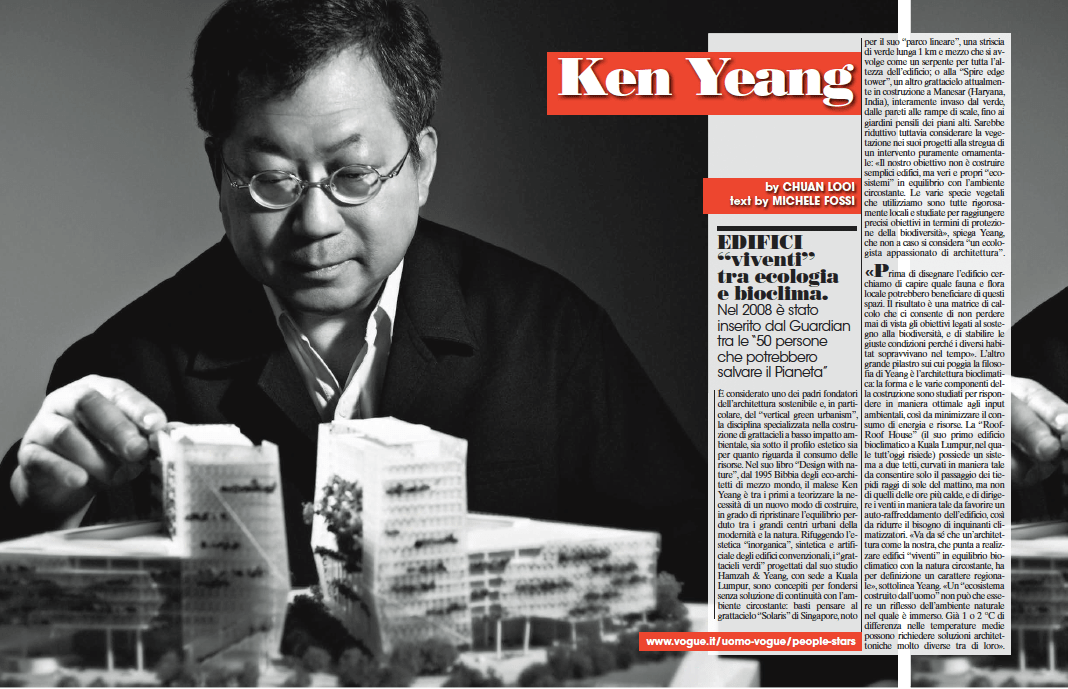 È considerato uno dei padri fondatori dell’architettura sostenibile ed in particolare, del “vertical green urbanism”, la disciplina specializzata nella costruzione di grattacieli a basso impatto ambientale, sia sotto il profilo estetico che quello del consumo delle risorse. Nel suo libro “Designing with Nature”, pubblicato nel 1995, considerato oggi una “Bibbia” dagli eco-architetti di mezzo mondo, l’architetto malese Ken Yeang – inserito nel 2008 dal The Guardian nella lista delle “50 persone che potrebbero salvare il pianeta” – è tra i primi a teorizzare la necessità di un nuovo modo di costruire, in grado di ripristinare l’equilibrio perduto tra i grandi centri urbani della modernità e la Natura. Rifuggendo l’estetica “inorganica”, sintetica ed artificiale degli edifici convenzionali, i  “grattacieli verdi” progettati dal suo studio “Hamzah and Yeang”, con sede a Kuala Lumpur,  sono concepiti  per fondersi senza soluzione di continuità con l’ambiente circostante: basti pensare al grattacielo “Solaris” di Singapore, noto per il suo “parco lineare” – una striscia di verde lunga un chilometro e mezzo che si avvolge come un serpente per tutta l’altezza dell’edificio –,  o alla “Spire edge tower”, un altro grattacielo attualmente in costruzione a Haryana, in India, interamente invaso dal verde, dalle pareti alle rampe di scale, su su fino ad una serie di giardini pensili a coronamento dei piani alti. Sarebbe riduttivo tuttavia considerare la vegetazione nei suoi progetti alla stregua di un intervento meramente cosmetico, ornamentale: «Il nostro obiettivo non è costruire semplici edifici, ma veri e propri “eco-sistemi” in equilibrio con l’ambiente circostante. Le varie specie vegetali che utilizziamo sono tutte rigorosamente locali e studiate per raggiungere precisi obiettivi in termini di protezione della biodiversità, come ad esempio il ritorno in città  di certe specie di uccelli scomparsi da tempo», spiega Yeang, che non a caso si considera “un ecologista appassionato di architettura”, più che un architetto. «Prima di disegnare l’edificio, partiamo col creare gli “ecosistemi” che vogliamo esso contenga nella sua struttura. Successivamente intraprendiamo una fase di ricerca per capire quale fauna e flora locale potrebbe beneficiare di questi spazi. Il risultato è una matrice di calcolo che, durante la fase di progettazione,  ci consente di non perdere mai di vista i vari obiettivi legati al sostegno alla biodiversità che ci siamo posti, e di stabilire le giuste condizioni perché tutti questi diversi habitat sopravvivano nel tempo». L’altro grande pilastro sui cui poggia la filosofia di Yeang è l’architettura bioclimatica:  la forma e le varie componenti della costruzione sono  studiati cioè per rispondere in maniera ottimale agli input ambientali, così da minimizzare il consumo di energia e risorse”. Nella “Roof-Roof’ House” (il suo primo edificio bioclimatico a Kuala Lumpur, nel quale tutt’oggi risiede), ad esempio,  concepisce un sistema a due tetti, curvati in maniera tale da consentire solo il passaggio dei tiepidi raggi del sole del mattino, ma non di quelli  delle ore più calde, e di dirigere i venti in maniera tale da favorire un auto-raffreddamento dell’edificio, così da ridurre il bisogno di inquinanti climatizzatori. «Va da sé che un’architettura come la nostra, che punta a realizzare edifici “viventi” in equilibrio bioclimatico con la natura circostante, ha per definizione un carattere regionale», sottolinea Yeang. «Un “ecosistema costruito dall’Uomo” non infatti può che essere un riflesso dell’ambiente naturale nel quale è immerso. Già 1°C o 2°C di differenza nelle temperature medie possono fare una differenza enorme, e richiedere soluzioni architettoniche molto diverse tra di loro».