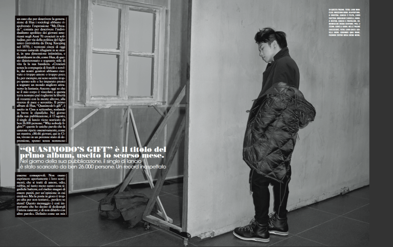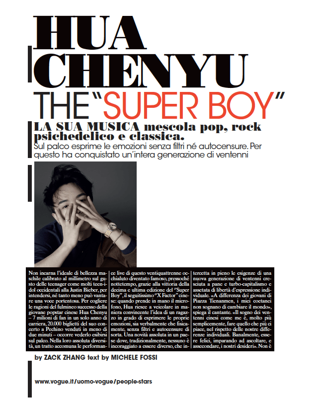 Non incarna l’ideale di bellezza maschile calibrato al millimetro sul gusto delle teen-ager, come molti teen-idol occidentali alla Justin Biber, per intendersi, né tanto meno può vantare una voce portentosa. Per cogliere le ragioni del fulmineo successo della giovane popstar cinese Hua Chenyu – 7 milioni di fan in un solo anno di carriera, 20 000 biglietti del suo concerto a Pechino venduti in meno di due minuti – occorre vederlo esibirsi sul palco. Nella loro assoluta diversità, un tratto accomuna le performance live di questo ventiquattrenne occhialuto diventato famoso, pressoché nottetempo, grazie alla vittoria della decima ed ultima edizione del “Superboy”, il seguitissimo “X-Factor” cinese: quando prende in mano il microfono, Hua riesce a veicolare in maniera convincente l’idea di un ragazzo in grado di esprimere le proprie emozioni, sia verbalmente che fisicamente, senza filtri ed autocensure di sorta. Una novità assoluta in un paese dove, tradizionalmente, nessuno ė incoraggiato ad essere diverso, che intercetta in pieno le esigenze di una nuova generazione di ventenni cresciuta a pane e turbo-capitalismo ed assetata di libertà d’espressione individuale. «A differenza dei giovani di Piazza Tienanmen, i miei coetanei non sognano di cambiare il mondo», spiega il cantante. «Il sogno dei ventenni cinesi come me è, molto più semplicemente, fare quello che più ci piace, nel rispetto delle nostre differenze individuali. Banalmente, essere felici, imparando ad ascoltare, e assecondare, i nostri desideri». Non è un caso che per descrivere la generazione di Hua i sociologi abbiano rispolverato l’espressione “Me-Decade”, coniata per descrivere l’individualismo apolitico dei giovani americani negli anni ’70: cresciuti in solitudine, per via della politica del figlio unico (introdotta da Den Xiao Peng nel 1979), i ventenni cinesi di oggi trovano naturale rifugiarsi in se stessi, in una dimensione intimistica, ed identifcarsi in chi, come Hua, di questo disinteressato e sognante stile di vita fa la sua bandiera. «Cresciuti senza la compagnia di fratelli e sorelle, dai nostri genitori abbiamo ricevuto o troppo amore o troppo poco. Io, ad esempio, mi sono sentito troppo spesso solo, ed ho imparato presto a sognare un mondo migliore volando sulle ali della fantasia. Ancora oggi so che, se il mio corpo è vincolato a questa terra, nessuno può togliermi la libertà di recarmi con la mente altrove, alla ricerca di pace e serenità». Il primo album di Hua, “Why nobody fights”, è uscito in Cina a Settembre, scalando in breve le classifiche. Nel giorno della sua pubblicazione, il 15 Agosto, l’omonimo single di lancio viene scaricato da ben 26 000 persone. “Why nobody fights? Why nobody stands out?”: queste le uniche parole che la canzone ripete ossessivamente, come un mantra. «Molti giovani, qui in Cina, vivono in un perenne stato di depressione, spesso senza nemmeno esserne consci. Non osano esprimere apertamente i loro sentimenti, che sia amore, odio, rabbia, né tanto meno sanno cosa voglia dire battersi, col rischio magari di essere puniti, per un’opinione in cui credono. Ma la posta in gioco è troppo alta per non tentarci… perdere se stessi! Questo messaggio è così importante, che ho deciso di dedicargli l’intera canzone, e di non diluirlo con altre parole.» Definito come un mix di rock psichedelico e musica classica (con addirittura qualche breve incursione nell’opera), nello stile dell’album di debutto di Hua è possibile individuare influenze delle sue band preferite: Muse, Radiohead and 30s to the Mars. «Quando scrivo canzoni, solitamente cerco di raggiungere una mia sintesi personale tra pop e musica classica. Il pezzo “Quasimodo’s gift”, nato per caso dalla vista di un dipinto durante un viaggio in Europa, costituisce forse il miglior esempio di questa ricerca», spiega. «Sento entrambi questi universi musicali vicini in ugual misura. Ho imparato a suonare il flauto traverso quando ero bambino e da allora la musica classica si è aperta canali privilegiati che arrivano dritti al mio cuore. Ma anche col pop, o il rock, sento non di meno di poter dar voce ad anime autentiche della mia personalità». Nel rievocare l’emozione della vittoria al “Superboy”, la scorsa estate, Hua non fa mistero di aver vissuto poco serenamente, in un primo tempo, l’arrivo di una notorietà tanto inattesa quanto improvvisa. «Quando, nel giro di poche ore, ti trovi circondato da migliaia, milioni di persone che ti fanno oggetto del loro amore, istintivamente ti viene spontaneo volerli contraccambiare. Solo che non sai bene come fare! In un primo tempo sono stato preso letteralmente dall’angoscia di non riuscire ad esprimere sufficientemente la mia gratitudine: ricordo di essermi sentito un po’ sperso, sopraffatto da una sensazione di inadeguatezza. Poi, col tempo, ho imparato che lavorare con passione alla mia musica era il migliore regalo che potessi fare ai miei Martians (nome dei supporter di Hua, ndr). Ho imparato così a stare tranquillo, sia quando il lavoro è troppo, sia quando è troppo poco. Quando la tensione si allenta, mi godo con gusto i miei momenti di relax: del resto sono sempre stato uno “Zhai Nan”, espressione cinese che indica chi passa più tempo possibile a casa, un comodone, un pantofolaio! e non ho certo intenzione di cambiare adesso!»