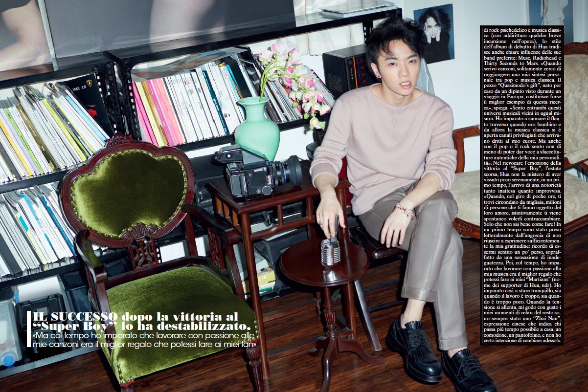 Non incarna l’ideale di bellezza maschile calibrato al millimetro sul gusto delle teen-ager, come molti teen-idol occidentali alla Justin Biber, per intendersi, né tanto meno può vantare una voce portentosa. Per cogliere le ragioni del fulmineo successo della giovane popstar cinese Hua Chenyu – 7 milioni di fan in un solo anno di carriera, 20 000 biglietti del suo concerto a Pechino venduti in meno di due minuti – occorre vederlo esibirsi sul palco. Nella loro assoluta diversità, un tratto accomuna le performance live di questo ventiquattrenne occhialuto diventato famoso, pressoché nottetempo, grazie alla vittoria della decima ed ultima edizione del “Superboy”, il seguitissimo “X-Factor” cinese: quando prende in mano il microfono, Hua riesce a veicolare in maniera convincente l’idea di un ragazzo in grado di esprimere le proprie emozioni, sia verbalmente che fisicamente, senza filtri ed autocensure di sorta. Una novità assoluta in un paese dove, tradizionalmente, nessuno ė incoraggiato ad essere diverso, che intercetta in pieno le esigenze di una nuova generazione di ventenni cresciuta a pane e turbo-capitalismo ed assetata di libertà d’espressione individuale. «A differenza dei giovani di Piazza Tienanmen, i miei coetanei non sognano di cambiare il mondo», spiega il cantante. «Il sogno dei ventenni cinesi come me è, molto più semplicemente, fare quello che più ci piace, nel rispetto delle nostre differenze individuali. Banalmente, essere felici, imparando ad ascoltare, e assecondare, i nostri desideri». Non è un caso che per descrivere la generazione di Hua i sociologi abbiano rispolverato l’espressione “Me-Decade”, coniata per descrivere l’individualismo apolitico dei giovani americani negli anni ’70: cresciuti in solitudine, per via della politica del figlio unico (introdotta da Den Xiao Peng nel 1979), i ventenni cinesi di oggi trovano naturale rifugiarsi in se stessi, in una dimensione intimistica, ed identifcarsi in chi, come Hua, di questo disinteressato e sognante stile di vita fa la sua bandiera. «Cresciuti senza la compagnia di fratelli e sorelle, dai nostri genitori abbiamo ricevuto o troppo amore o troppo poco. Io, ad esempio, mi sono sentito troppo spesso solo, ed ho imparato presto a sognare un mondo migliore volando sulle ali della fantasia. Ancora oggi so che, se il mio corpo è vincolato a questa terra, nessuno può togliermi la libertà di recarmi con la mente altrove, alla ricerca di pace e serenità». Il primo album di Hua, “Why nobody fights”, è uscito in Cina a Settembre, scalando in breve le classifiche. Nel giorno della sua pubblicazione, il 15 Agosto, l’omonimo single di lancio viene scaricato da ben 26 000 persone. “Why nobody fights? Why nobody stands out?”: queste le uniche parole che la canzone ripete ossessivamente, come un mantra. «Molti giovani, qui in Cina, vivono in un perenne stato di depressione, spesso senza nemmeno esserne consci. Non osano esprimere apertamente i loro sentimenti, che sia amore, odio, rabbia, né tanto meno sanno cosa voglia dire battersi, col rischio magari di essere puniti, per un’opinione in cui credono. Ma la posta in gioco è troppo alta per non tentarci… perdere se stessi! Questo messaggio è così importante, che ho deciso di dedicargli l’intera canzone, e di non diluirlo con altre parole.» Definito come un mix di rock psichedelico e musica classica (con addirittura qualche breve incursione nell’opera), nello stile dell’album di debutto di Hua è possibile individuare influenze delle sue band preferite: Muse, Radiohead and 30s to the Mars. «Quando scrivo canzoni, solitamente cerco di raggiungere una mia sintesi personale tra pop e musica classica. Il pezzo “Quasimodo’s gift”, nato per caso dalla vista di un dipinto durante un viaggio in Europa, costituisce forse il miglior esempio di questa ricerca», spiega. «Sento entrambi questi universi musicali vicini in ugual misura. Ho imparato a suonare il flauto traverso quando ero bambino e da allora la musica classica si è aperta canali privilegiati che arrivano dritti al mio cuore. Ma anche col pop, o il rock, sento non di meno di poter dar voce ad anime autentiche della mia personalità». Nel rievocare l’emozione della vittoria al “Superboy”, la scorsa estate, Hua non fa mistero di aver vissuto poco serenamente, in un primo tempo, l’arrivo di una notorietà tanto inattesa quanto improvvisa. «Quando, nel giro di poche ore, ti trovi circondato da migliaia, milioni di persone che ti fanno oggetto del loro amore, istintivamente ti viene spontaneo volerli contraccambiare. Solo che non sai bene come fare! In un primo tempo sono stato preso letteralmente dall’angoscia di non riuscire ad esprimere sufficientemente la mia gratitudine: ricordo di essermi sentito un po’ sperso, sopraffatto da una sensazione di inadeguatezza. Poi, col tempo, ho imparato che lavorare con passione alla mia musica era il migliore regalo che potessi fare ai miei Martians (nome dei supporter di Hua, ndr). Ho imparato così a stare tranquillo, sia quando il lavoro è troppo, sia quando è troppo poco. Quando la tensione si allenta, mi godo con gusto i miei momenti di relax: del resto sono sempre stato uno “Zhai Nan”, espressione cinese che indica chi passa più tempo possibile a casa, un comodone, un pantofolaio! e non ho certo intenzione di cambiare adesso!»