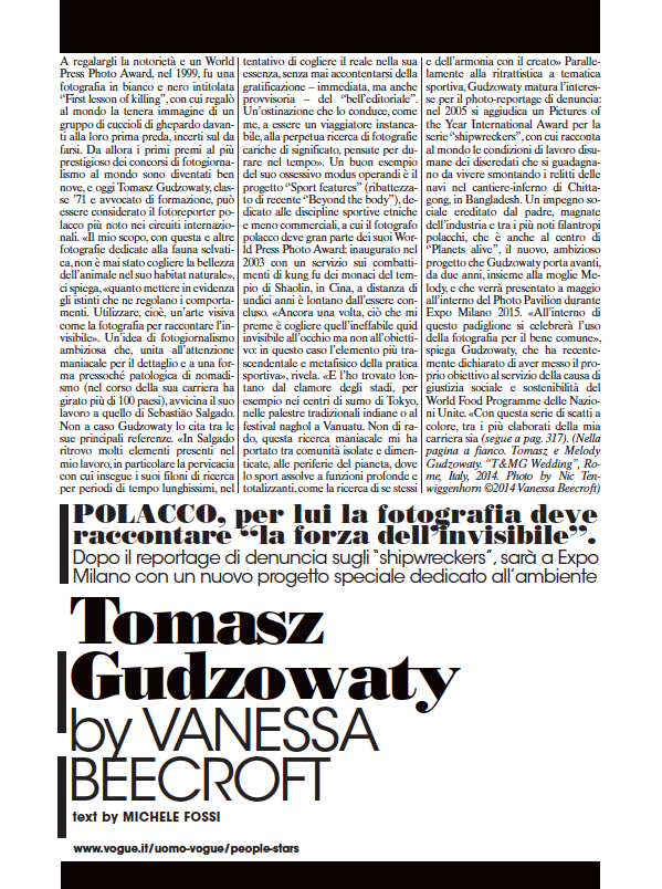 Parallelamente alla ritrattistica a tematica sportiva, Gudzowaty matura l’interesse per il photo-reportage di denuncia: nel 2005 si aggiudica un Pictures of the Year International Award per la serie “shipwreckers”, con cui racconta al mondo le condizioni di lavoro disumane dei diseredati che si guadagnano da vivere smontando i relitti delle navi nel cantiere-inferno di Chittagong, in Bangladesh. Un impegno sociale ereditato dal padre, magnate dell’industria e tra i più noti filantropi polacchi, che è anche al centro di “Planets alive”, il nuovo, ambizioso progetto che Gudzowaty porta avanti, da due anni, insieme alla moglie Melody, e che verrà presentato a maggio all’interno del Photo Pavilion durante Expo Milano 2015. «All’interno di questo padiglione si celebrerà l’uso della fotografia per il bene comune», spiega Gudzowaty, che ha recentemente dichiarato di aver messo il proprio obiettivo al servizio della causa di giustizia sociale e sostenibilità del World Food Programme delle Nazioni Unite. «Con questa serie di scatti a colore, tra i più elaborati della mia carriera sia sotto il profilo estetico che della composizione, io e mia moglie – che in questo progetto è partner al 50% e non solo modella – abbiamo voluto rappresentare le peculiarità dei pianeti del sistema solare. Parlo di caratteristiche morfologiche e mitologiche. In ognuno vedremo una figura femminile (interpretata da Melody) posare al centro di paesaggi primigeni e incontaminati, affiancata non di rado da animali selvatici di cui non sembra temere la ferocia. Fotografie che, attraverso il loro potere evocativo, spero suscitino nello spettatore la consapevolezza che non siamo gli unici abitanti della terra, e che la ricerca di una nuova armonia con la natura è non solo quanto mai urgente e necessaria, ma anche possibile. Il tutto – questo almeno il tentativo – senza mai scadere nel didascalico: l’arte è una maestra straordinaria, ma solo quando educa indirettamente, attraverso allusioni e associazioni, stimolando l’immaginazione. Se sale in cattedra a lanciare sermoni, solitamente fallisce».