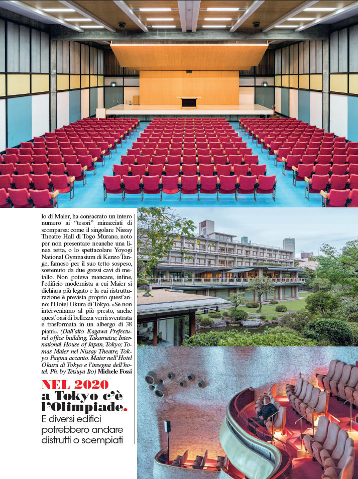 Con l’infervorare dei preparativi per le Olimpiadi di Tokyo del 2020, il rischio che molti dei capolavori dell’architettura modernista giapponese vadano distrutti, o irrimediabilmente scempiati, è altissimo. Questo l’allarme lanciato da alcuni tra i più famosi architetti giapponesi, come Fumihiko Maki e Toshiko Mori, intervenuti al simposio patrocinato da Bottega Veneta presso il 21st Century Museum of Contemporary Art, svoltosi a Kanazawa il 2 novembre scorso. Un incontro che – scopriamo parlando con Tomas Maier, direttore creativo di Bottega Veneta e noto appassionato di architettura nipponica – intende essere solo la prima di una serie di iniziative di sensibilizzazione patrocinate dalla griffe vicentina in difesa dell’architettura modernista del Sol Levante. «Se l’architettura tradizionale del Giappone è per lo più considerata un tesoro nazionale, lo stesso non può essere detto per gran parte dei capolavori del modernismo, trattati solitamente alla stregua di edifici qualunque, e demoliti non di rado per una semplice non conformità alle norme antisismiche: si pensi alla sorte toccata agli eleganti uffici postali centrali di Tokyo e Osaka, considerati le opere prime di Tetsuro Yoshida, distrutti per sempre dalle ruspe», denuncia lo stilista tedesco. «Se questi tesori culturali non saranno oggetto di un’ulteriore riflessione, soprattutto in Giappone, la bellezza e la maestria che rappresentano andranno perse per sempre». Nasce da queste premesse anche la collaborazione tra Bottega Veneta e Casa Brutus, la più importante rivista di architettura del Giappone, che questo Gennaio, raccogliendo l’appello di Meier, ha consacrato un intero numero ai tesori del modernismo giapponese minacciati di scomparsa: come il singolare Nissay Theater Hall di Togo Murano, noto per non presentare neanche una linea retta, o lo spettacolare Yoyogi National Gymnasium di Kenzo Tange, famoso per il suo tetto sospeso, sostenuto da due grossi cavi di metallo. Non poteva mancare, infine, l’edificio modernista a cui Meier si dichiara più legato emotivamente: l’Hotel Okura di Tokyo. «Bastò varcarne la soglia dopo un lungo viaggio a metà degli anni ’80, perché in me nascesse una passione per l’architettura giapponese del dopoguerra che non mi ha più abbandonato. Rimasi letteralmente a bocca aperta, rapito dalla bellezza delle lampade di fattura artigianale e delle pareti scorrevoli Shoji, che lasciano filtrare la luce al suo interno in maniera molto suggestiva. Se non interverremo, anche quest’oasi di bellezza è destinata ad essere sventrata e trasformata in un albergo di 38 piani. Già nel 2015.»