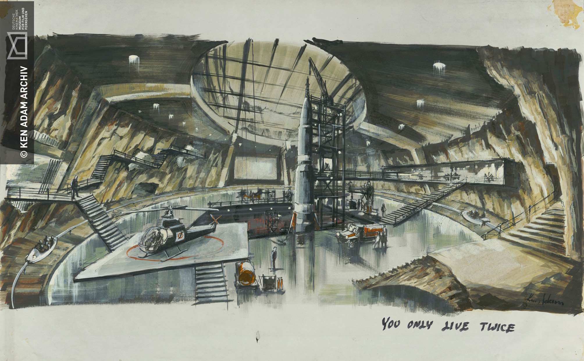 Vincitore di due Oscar alla migliore scenografia (nel 1976 per il set di “Barry Lyndon” di Stanley Kubrick e nel 1995, per la “Pazzia di re Giorgio” di Nicholas Hytner) ed autore dei set di oltre 70 film, Ken Adam, anche se il suo nome non è dei più noti, è considerato universalmente uno degli scenografi più influenti del novecento. Il suo fedele pennarello Flo-master in una mano e, immancabile, una sigaretta nell’altra, in oltre 40 anni di carriera ha disegnato di tutto: dal palazzo de “L’ultimo imperatore” fino ai sinistri interni della villa della Famiglia Addams, ma il suo nome sarà per sempre associato alle scenografie per i film della serie “Agente 007” (sette in tutto tra il 1962 ed il 1977) «con le quali, grazie a budget impensabili in altre produzioni, poté esprimere al meglio la sua fascinazione per le architetture sovradimensionate», spiega Peter Mänz, curatore di “BIGGER THAN LIFE”, la bella mostra, visitabile fino al 17 Maggio 2015, con cui la Deutsche Kinematek di Berlino celebra la fervida creatività dello scenografo tedesco-britannico oggi novantaquattrenne, che, rampollo di una famiglia ebraica in vista, proprio nella capitale tedesca visse i primi dodici anni della sua vita. «Il titolo della mostra, che in autunno riaprirà i battenti a Monaco di Baviera, fa riferimento al tentativo di Adam di superare i limiti dell’immaginabile in architettura, attraverso set il più imponenti e ciclopici possibile, che paiono sfidare le leggi della fisica, eppure sempre realizzabili», spiega Mänz. Un aspetto particolarmente evidente nella sezione della mostra dedicata alle tante “Centrali del potere”, titaniche metafore spaziali delle manie di grandezza dei vari dittatori, politici e cattivi di turno, con cui Adam ci ha regalato le sue scenografie più memorabili: si pensi al quartier generale dell’antagonista di Bond in “Si vive solo due volte” (1967) , immaginato niente meno che dentro al cratere di un vulcano, o all’imponente “Stanza della guerra” ne “Il dottor Stranamore” di Kubrick (1963), che Adam disegna a sezione triangolare, con al centro, immediatamente sopra il tavolo dei potenti, un enorme lampadario circolare sorretto da cavi d’acciaio. «In quasi tutti i disegni di Adam ricorrono figure geometriche semplici, come il cerchio, il triangolo scaleno, il rettangolo: è la sua “zeta di Zorro”. Nella hall della banca in “Pennies from Heaven”, ad esempio, prevede due enormi scalinate che disegnano, con il loro profilo, due triangoli, con cui spezza la monotonia di un ambiente dominato altrimenti dal rettangolo; nella claustrofobica “Tarantula room” in “Agente 007 – Licenza di uccidere” immagina invece un’unica apertura sul soffitto a forma circolare, ispirata, per sua stessa ammissione, dai disegni seicenteschi delle “Carceri” di Giovanni Battista Piranesi». Un’estetica rotondeggiante e biomorfa, che ricorda il lavoro di Luigi Colani, caratterizza invece il design dei curiosi mezzi di trasporto, terrestri, aerei ed acquatici, che Adam, appassionato di meccanica, progettò, insieme alle scenografie, per consentire al suo James Bond di battere in velocità i suoi numerosi nemici, e persino di volare. «Proprio come in Colani, all’origine di queste forme aerodinamiche vi è una ricerca continua del brivido della velocità che ha accompagnato Adam, ex pilota di un cacciabombardiere durante la guerra, per tutta la vita e che egli, più o meno consciamente, sembra riversare anche nei suoi dinamici disegni, che, grazie ad un sapiente uso della pressione del pennarello, paiono vibrare di energia, quasi li stessimo osservando da un mezzo in movimento».