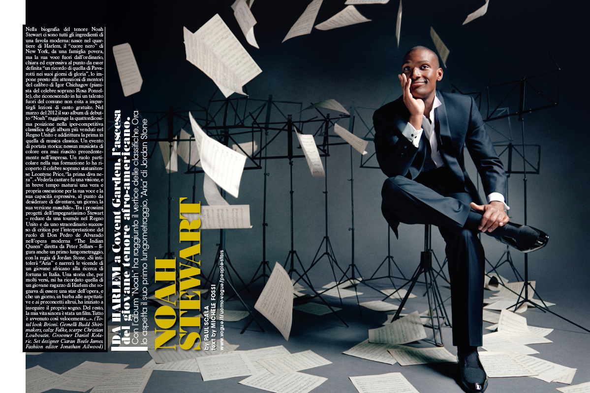 Nella biografia del tenore Noah Stewart ci sono tutti gli ingredienti di una favola moderna: nasce nel quartiere di Harlem, il “cuore nero” di New York, da una famiglia povera, ma la sua voce fuori dell’ordinario, chiara ed espressiva al punto da esser definita dal Milwaukee Magazine “un ricordo di quella di Pavarotti nei suoi giorni di gloria”, lo impone presto alle attenzioni di mentori del calibro di Igor Chichaigov (pianista del celebre soprano Rosa Ponselle), che, riconoscendo in lui un talento fuori del comune, non esita ad impartirgli lezioni di canto gratuite. Nel Marzo del 2012, il suo album di debutto “Noah”, raggiunge la quattordicesima posizione della iper-competitiva classifica degli album più venduti nel Regno Unito e addirittura la prima nella classifica degli album di musica Classica. Un evento di portata storica: nessun musicista di colore era mai riuscito precedentemente nell’impresa. Un ruolo particolare nella sua formazione, racconta il tenore, lo ha svolto “la prima diva nera”, il celeberrimo soprano statunitense Leontyne Price. “Vederla cantare fu una visione, e in breve tempo maturai una vera e propria ossessione per la sua voce e la sua capacità espressiva, al punto da desiderare di diventare, un giorno, la versione maschile del suo talento”. Tra i prossimi progetti dell’impegnatissimo Stewart – reduce da una tournée nel regno Unito e da uno straordinario successo di critica per l’interpretazione del ruolo di Don Pedro Alvarado nell’opera moderna “Indian Queen” diretta da Peter Sellars – figura anche un primo lungometraggio, con regia di Jordan Stone. “S’intitolerà “Aria”, rivela, “e narrerà le vicende di un giovane africano alla ricerca di fortuna in Italia. Una storia che, per molti versi, mi ha ricordato quella di un giovane ragazzo di Harlem che sognava di essere una star dell’opera, e un giorno, in barba alle aspettative ed ai preconcetti degli altri, si è messo in cammino all’inseguimento del proprio sogno. Del resto la mia vita finora è stata un film. Tutto è avvenuto così veloce. Mi sveglio a Londra, all’indomani di uno spettacolo al Covent Garden, e a volte mi capita di pensare… che ci faccio qua?”