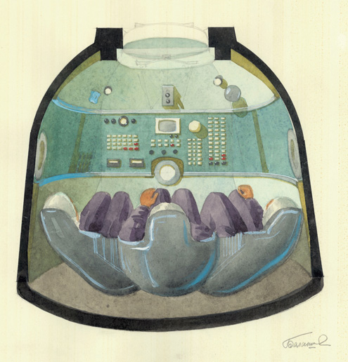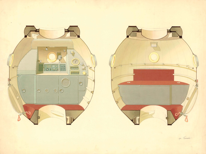 L’Olimpo della conquista dello spazio sovietica si riduce essenzialmente a quattro divinità: Yuri Gagarin e Valentina Tereshkova, rispettivamente il primo uomo e la prima donna ad andare nello spazio; Sergei Krikalev, il detentore del record di numero di giorni passati in orbita ed infine Alexey Leonov, il primo uomo a lasciare la sua capsula spaziale ed a “passeggiare tra le stelle”. Ingiustamente rimasto nell’ombra, invece, il nome dell’ “esteta” dell’intero programma spaziale dell’URSS: l’architetto, designer e pittrice Galina Balashova, mente creativa dietro al design degli interni di ben 4 generazioni di astronavi, dalle capsule Soyuz alle stazioni orbitanti Salyut e Mir, fino alla navicella riutilizzabile “Buran”, oltre che autrice di innumerevoli medaglie ed emblemi commemorativi delle missioni spaziali. «Con la sua pionieristica opera – nessuno prima di lei si era infatti cimentato nell’architettura e nel design di interni per lo spazio – la Balashova, unica architetto ed artista in una squadra di soli ingegneri e tecnici, ha inaugurato niente meno che una nuova branca delle scienze delle costruzioni, l’ “architettura cosmonautica”», spiega l’architetto ed editore berlinese Philipp Meuser, curatore della mostra “Design for the Soviet Space Programme”, visibile fino al 15 Novembre al Deutsches Architekturmuseum (DAM) di Francoforte, la prima esposizione monografica dedicata alla vasta opera della designer e architetto moscovita, oggi ottantaquattrenne. Un’occasione unica per ammirare, per la prima volta in Occidente, centinaia di schizzi e colorati acquerelli tenuti, fino a non molti anni fa, sotto stretto segreto militare, e, per la gioia degli appassionati di cosmonautica, avventurarsi in una ricostruzione in scala 1:1 degli interni della stazione orbitante Mir. «A distanza di quarant’anni, la sua opera continua ad influenzare profondamente l’industria aerospaziale: gran parte delle sue idee per la Stazione Spaziale Internazionale o per la stazione Mir trovano ampia applicazione, con poche modifiche, ancora al giorno d’oggi». Un’architettura libera dalla forza di gravità: ciò che le avanguardie russe avevano proposto alcuni decenni prima in chiave utopica e provocatoria, si pensi alle “città volanti” di Georgii Krutikov, ai “Prounes” di Lissitzky o ai “Planiti” di Malevich, per la Balashova era pane quotidiano, l’assunto base dietro ad ogni nuovo progetto. «Nel disegnare ambienti per lo spazio, dove l’assenza di gravità rende ogni direzione equivalente, un architetto gode di libertà creative impensabili sulla Terra. Tanto per cominciare egli può rinunciare, se lo desidera, alla classica distinzione tra soffitto e pavimento: era questa la mia idea centrale dietro agli interni del “LOK”, la navicella – mai realizzata – che avrebbe dovuto portare i nostri astronauti in orbita attorno alla Luna prima degli Americani. Per limitare il senso di spaesamento degli astronauti, nei miei altri progetti ho sempre preferito suggerire nei disegni un senso del sopra e del sotto, optando solitamente per colori più scuri per l’area calpestabile designata a simulare la presenza di un pavimento», spiega la designer. «In quanto designer di interni, per un’astronave puoi sbizzarrirti a progettare mobili utilizzabili anche capovolti o inclinati, come letti per dormire in verticale, o addirittura sdraiati sul soffitto, o tapis-roulant per fare jogging su una parete. A prevalere erano tuttavia il gran numero di vincoli e restrizioni legati a questioni di sicurezza: la scelta dei materiali si restringeva a quelli non infiammabili, non tossici, ed in grado di filtrare le radiazioni spaziali; la distribuzione del peso all’interno degli abitacoli doveva inoltre essere studiata nel minimo dettaglio, per non pregiudicare la stabilità della traiettoria dell’astronave». L’avventura spaziale di Galina Balashova inizia nel 1957, anno in cui, dopo aver concluso gli studi all’Istituto di Architettura di Mosca, viene assunta all’OKB-1, l’agenzia spaziale sovietica, successivamente ribattezzata RKK Energija. Dopo aver lavorato, per alcuni anni, alla progettazione di appartamenti per gli impiegati dell’azienda, nel 1963, con sua sorpresa, le venne affidato il primo incarico di architettura extra-terrestre. «Nel 1963, l’equipe di Design dell’OKB-1 aveva concluso con successo la progettazione della prima navicella spaziale Soyuz. A differenza dei modelli precedenti, come il celebre Vostok 1 che nel 1961 portò Gagarin in orbita attorno alla Terra, che prevedevano solo un’angusta cabina di pilotaggio, Soyuz nasceva per consentire esplorazioni spaziali di maggior durata, ed era dunque necessario creare al suo interno una vera e propria unità abitativa». La Balashova si ritrovò così ad essere responsabile di tutti gli aspetti di design di quello che potrebbe essere definito “Il primo monolocale nello spazio”, dalla scelta delle proporzioni e dei colori alla selezione dei materiali fino all’arredo. «Optai per mobili tipici di ambienti residenziali, come il divano e la credenza, adattandoli alle esigenze della navigazione spaziale: prevedendo ad esempio al loro interno ampio spazio per integrare un gran numero di strumentazioni ed adattandone la forma alle caratteristiche ovoidali dell’abitacolo. Ero tenuta ad evitare spigoli affilati ed angoli appuntiti e a concepire opportuni sistemi di fissaggio per gli oggetti, per evitare che si librassero nel vuoto e ferissero gli astronauti. Inizialmente pensai a delle cinghie, ma presto mi resi conto che dei sistemi a strappo come il velcro erano molto più indicati. Gli interni delle astronavi erano dunque sorprendentemente soffici al tatto, perché in gran parte ricoperti del materiale lanuginoso su cui venivano fermati strumenti e utensili». Nel 1973, con l’avvio della collaborazione tra le agenzie spaziali di USA e URSS, che culminò con lo storico