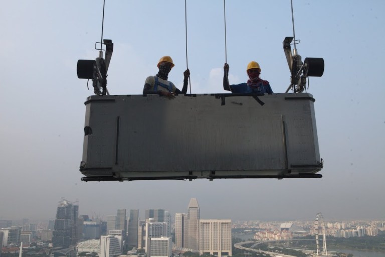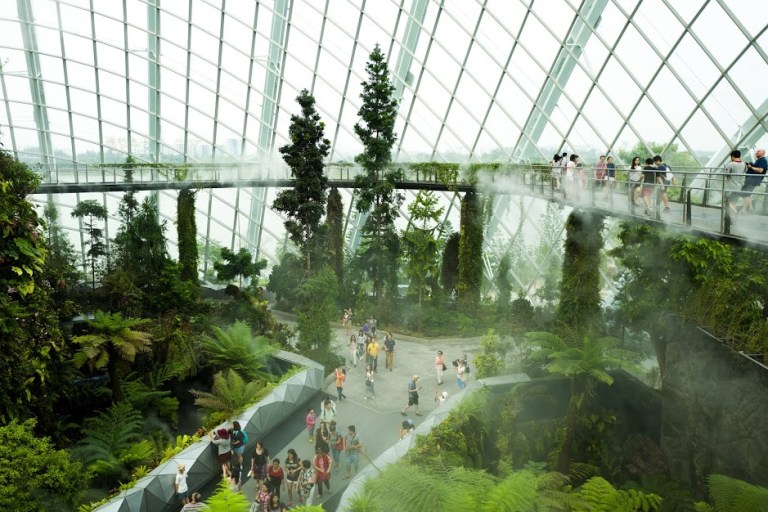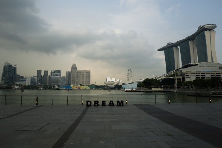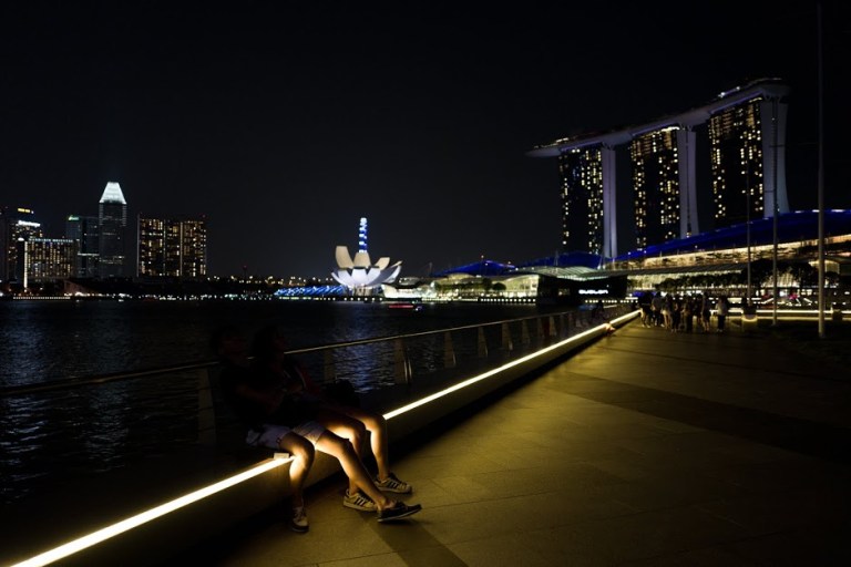 Sporgendosi dalla vertiginosa terrazza panoramica del bar “1-Altitude”, al sessantatreesimo piano del grattacielo “1 Raffle Place”, si capisce perché quello di Singapore è stato definito uno degli skyline più belli del mondo. Difficile non posare inizialmente lo sguardo sull’inconfondibile piattaforma sospesa nel vuoto dell’hotel Marina Bay Sands: sfida ingegneristica tra le più folli di sempre, che fa pensare ad una nave arenata miracolosamente su tre monoliti di vetro e cemento, pericolosamente in bilico. Poco distanti, le due macro-serre del parco Gardens by the Bay, una dedicata a fiori e cactus e l’altra alla vegetazione tropicale, si accendono di luce al tramonto come astronavi appena atterrate. A completare il quadro surreale, i colori lisergici e cangianti dei “super-trees” : diciotto torri alte dai venticinque ai cinquanta metri rivestite di piante tropicali e felci, che, come in un sogno ad occhi aperti, ricordano gli alberi a ombrello rovesciato del film Avatar.
