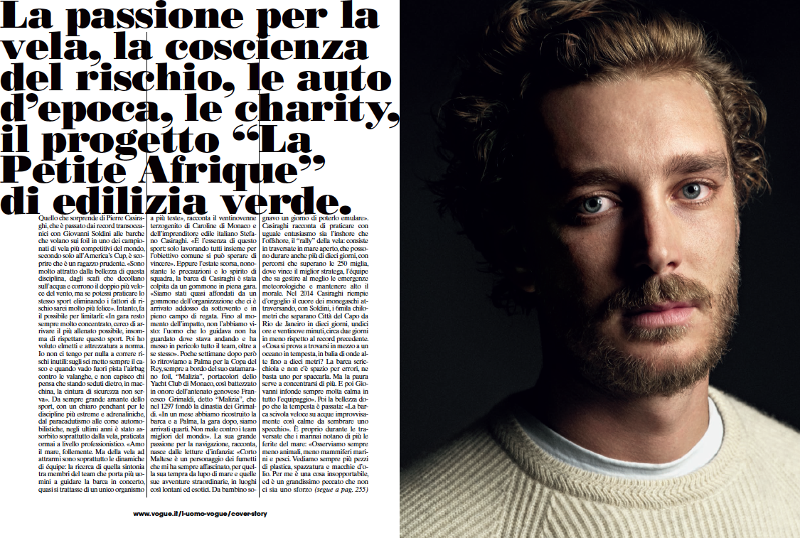 La sua grande passione per la navigazione, racconta, nasce dalle letture d’infanzia: «Corto Maltese è un personaggio dei fumetti che mi ha sempre affascinato, per quella sua tempra da lupo di mare e quelle sue avventure straordinarie, in mari così lontani ed esotici. Da bambino sognavo un giorno di poterlo emulare». Casiraghi racconta di praticare con uguale entusiasmo sia l’inshore che l’offshore, il “rally” della vela: consiste in traversate in mare aperto, che possono durare anche più di dieci giorni, con percorsi che superano le 250 miglia, dove vince il miglior stratega, l’équipe che sa gestire al meglio le emergenze meteorologiche e mantenere alto il morale. Nel 2014 Casiraghi riempie d’orgoglio il cuore dei monegaschi attraversando, con Soldini, i 6mila chilometri che separano Città del Capo da Rio de Janeiro in dieci giorni, undici ore e ventinove minuti, circa due giorni in meno rispetto al record precedente. «Cosa si prova a trovarsi in mezzo a un oceano in tempesta, in balia di onde alte fino a dieci metri? La barca scricchiola e non c’è spazio per errori, ne basta uno per spaccarla. Ma la paura serve a concentrarsi di più. E poi Giovanni infonde sempre molta calma in tutto l’equipaggio». Poi la bellezza dopo che la tempesta è passata: «La barca scivola veloce su acque improvvisamente così calme da parere uno specchio». È proprio durante le traversate che i marinai notano di più le ferite del mare: «Osserviamo sempre meno animali, meno mammiferi marini e pesci. Vediamo sempre più pezzi di plastica, spazzatura e macchie d’olio. Per me è una cosa insopportabile, ed è un grandissimo peccato che non ci sia uno sforzo condiviso, a livello globale, per educare i singoli al rispetto dell’ambiente e per aiutare i paesi in via di sviluppo a modernizzare gli impianti per smaltire i rifiuti, così da evitare che finiscano in mare».
