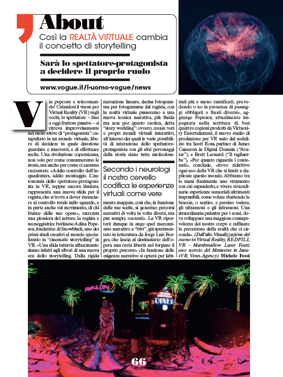 Via quei popcorn e quel telecomando! Calandosi il visore per Virtual Reality (VR) sugli occhi, lo spettatore, fino ad oggi fruitore passivo delle storie raccontate dal cinema e dalla TV, si ritrova improvvisamente nel ruolo attivo di “protagonista”: catapultato in un mondo virtuale, dove gli viene richiesto continuamente ad effettuare scelte, come decidere in quale direzione guardare ed in quale muoversi, o se interagire o meno con un personaggio. Una rivoluzione copernicana, non solo per come consumeremo le storie, ma anche per come ci verranno raccontate. «Addio controllo dell’inquadratura, addio montaggio: l’autonomia dello spettatore-protagonista in VR, seppur limitata, rappresenta una bella sfida per il regista, che deve rinunciare al controllo totale sullo sguardo, e in parte anche sul movimento, di chi fruisce delle sue opere», racconta una pioniera del settore, la regista e sceneggiatrice berlinese Adina Popescu, fondatrice di “Snowblack”, uno dei primi studi creativi al mondo specializzato in “cinematic story telling” in VR. «Una sfida tuttavia affascinante. Siamo infatti agli albori di una nuova era dello “story-telling”. Dalla rigida narrazione “lineare” di cinema e TV, decisa fotogramma per fotogramma dal regista, con la realtà virtuale passeremo ad una nuova tecnica narrativa, più fluida ma non per questo caotica, detta “story worlding”: come suggerisce il nome, si tratta di creare dei veri e propri “mondi virtuali” interattivi, all’interno dei quali le varie possibilità di interazione dello spettatore-protagonista con gli altri personaggi siano tutte meticolosamente mappate, così che, in funzione delle sue scelte, si generino percorsi narrativi di volta in volta diversi, ma pur sempre coerenti”. La VR riporterà dunque in auge quel meccanismo narrativo a “bivi”, già sperimentato in letteratura da Jorge Luis Borges nei suoi capolavori “Esame dell’opera di Herbert Quain” e “Il giardino dei sentieri che si biforcano”, che lascia al destinatario dell’opera una certa libertà nel forgiare il proprio percorso nella storia. «In funzione delle esigenze narrative, si opterà per labirinti narrativi più o meno ramificati, prevedendo o meno la presenza di passaggi obbligati o finali diversi», spiega la creativa, che parla con cognizione di causa: è attualmente impegnata nella scrittura di ben quattro copioni prodotti da “Virtuosity Entertainment”, il nuovo studio di produzione per VR nato dal sodalizio tra Scott Ross, parter di James Cameron in Digital Domain (Avatar), e Brett Leonard (“Il Tagliaerbe”).«Per quanto riguarda invece i contenuti», conclude, «trovo riduttivo ogni uso della VR che si limiti a “duplicare” questo mondo. Abbiamo tra le mani finalmente uno strumento con cui “espanderlo”, e vivere straordinarie esperienze sensoriali altrimenti impossibili. Come volare sbattendo le braccia, o attraversare le pareti di casa. O sentire, e persino vedere, gli ultrasuoni e gli infrasuoni. O magari ammirare sculture non soggette ai vincoli della geometria euclidea. Una straordinaria palestra per i sensi, dove sviluppare una maggiore consapevolezza del nostro corpo e raffinare la percezione della realtà che ci circonda. Il nostro cervello — è la neurologia a dirlo — codifica infatti le esperienze in VR né più né meno come esperienze di vita, al pari di quelle reali. Queste scoperte scientifiche, è evidente, comportano importanti responsabilità etiche da parte del creatore di contenuti per VR. A volte, lo confesso, mi domando se l’umanità sia pronta per ricevere tra le sue mani uno strumento così potente, in grado di cambiarci così nel profondo, nel bene e nel male».