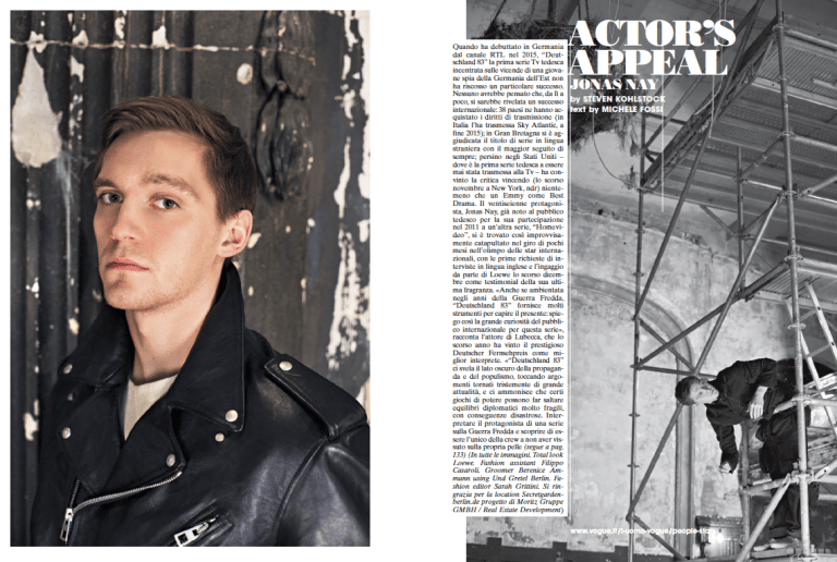 Quando fu trasmessa per la prima volta in Germania dal canale TV RTL nel 2015, “Deutschland 83”, la prima serie TV tedesca incentrata sulle vicende di una giovane spia della Germania dell’Est, non riscosse un particolare successo di audience. Chi avrebbe mai pensato che, da lì a poco, si sarebbe rivelata uno dei più grandi successi internazionali del cinema in lingua tedesca: trentotto paesi ne hanno acquistato i diritti di trasmissione; in Gran Bretagna si aggiudica il titolo di serie in lingua straniera di maggior successo di sempre; persino negli Stati Uniti, dove è la prima serie tedesca ad essere mai stata trasmessa alla TV, raccoglie il plauso unanime della critica, e si aggiudica, lo scorso novembre a New York, niente meno che un Emmy Award come “Best Drama”. Il ventiseienne protagonista della serie, Jonas Nay, già noto al pubblico tedesco per la sua partecipazione nel 2011 alla serie per la TV “Home Video”, si trova così improvvisamente catapultato nel giro di pochi mesi nell’olimpo delle star internazionali: per la prima volta, iniziano ad arrivare richieste di interviste in lingua inglese; Loewe lo scorso dicembre lo sceglie come testimonial della sua ultima fragranza. «Anche se ambientata negli anni della Guerra Fredda, Deutschland 83 fornisce molti strumenti per capire l’oggi: spiego così la grande curiosità del pubblico internazionale per questa serie», racconta l’attore di Lubecca, insignito lo scorso anno del prestigioso Deutscher Fernsehpreis al miglior attore. «Deutschland 83 ci svela il lato oscuro della propaganda e del populismo, toccando così argomenti tornati tristemente di grande attualità un po’ ovunque nel mondo. E ci ammonisce che certi giochi di potere tra stati e poteri forti possono portare alla rottura di equilibri diplomatici molto fragili, dalle conseguenze disastrose». «Essere il protagonista di una serie sulla guerra fredda, e scoprire di essere l’unico del crew a non aver vissuto sulla propria pelle quegli anni, è stato un po’ strano all’inizio», confessa. «Per molti tedeschi della mia età quegli anni costituiscono un vero e proprio “buco nero”: a scuola non se ne parla, perché è un periodo ancora troppo recente per essere materiale per i libri scolastici. Per la prima volta nella mia vita, mi sono ritrovato a chiedere ai miei genitori, che avevano all’incirca la mia età negli anni ‘80 di condividere con me i loro ricordi di quegli anni folli, in cui un muro divideva Berlino in due parti! È incredibile quante belle storie personali, avvincenti, spesso al limite dell’assurdo, sono emerse dai loro racconti e da quelli di amici e colleghi. Storie che non chiedono altro che di essere raccontate dal cinema, che oggi può finalmente iniziare a guardare a quegli anni col distacco richiesto dai film di ambientazione storica. Dopo il successo di Deutschland 83, non mi stupirebbe affatto se la Guerra Fredda diventasse un trend cinematografico dei prossimi anni. La curiosità per la Guerra Fredda, oggi, è tanta.». La fase di preparazione per Deutschland 83 si svolge a Berlino, dove Nay si stabilisce per tre mesi, durante i quali, oltre a documentarsi “notte e giorno” con libri, film e documentari sulla guerra fredda, riceve training accelerati sull’uso delle armi e delle strumentazioni di spionaggio dell’epoca. Insiste inoltre per imparare a combattere e a correre veloce, per poter girare anche le scene più acrobatiche ed al cardiopalma, soprattutto quelle di fuga, senza dover ricorrere ad una controfigura. «In nessuna altra città al mondo si può ancora toccare con mano la storia della Guerra Fredda come a Berlino. Oltre ai segmenti ancora in piedi del Muro, tra i luoghi della capitale che più hanno colpito la mia immaginazione vi è sicuramente il “Ministerium des Innerns” nella Behren Strasse, la vecchia sede del Ministero degli Interni della DDR», rivela. «Abbiamo avuto il permesso per girare all’interno di questo imponente edificio numerose scene della serie, persino quelle che si svolgevano in città occidentali, di cui abbiamo ricostruito le ambientazioni. Nei sotterranei, dove un tempo si svolgevano gli interrogatori e le sedute di tortura della Stasi, l’atmosfera che si respira è ancora molto pesante. Accedere a quelle stanze dell’orrore mi è stato di grande aiuto per ricostruire appieno nella mia mente il dramma e la follia di quegli anni».