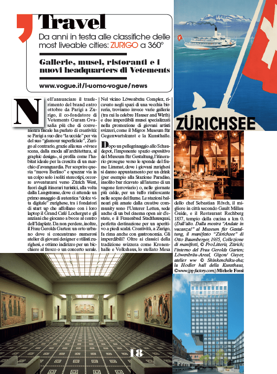 Nell’annunciare il trasferimento del brand entro Ottobre da Parigi a Zurigo, il co-fondatore di Vêtements Guram Gvasalia, in una recente intervista al quotidiano svizzero TA, più che di convenienza fiscale ne fa una questione di creatività: se Parigi a suo dire “la uccide”, per via del suo “glamour superficiale”, Zurigo al contrario, grazie alla sua “vivace scena, dalla moda all’architettura ed al graphic design”, si profila come l’habitat ideale per la crescita di un marchio di moda d’avanguardia. Per scoprire questa “nuova Berlino”, come la Zurigo contemporanea decantata da Gvasalia sempre più spesso viene chiamata, occorre avventurarsi verso Zürich West, fuori dagli itinerari turistici, alla volta dalla Langstrasse, dove ci attende un primo assaggio di autentica “dolce vita digitale” zurighese, tra i fondatori di start up che affollano con i loro laptop il Grand Café Lochergut e gli anziani che giocano a bocce al centro dell’Idaplatz. Passeggiando per le vie del quartiere alla scoperta delle numerose piccole boutique aperte di recente, troviamo a poca distanza sia il concept store Mooris.ch che il negozio di mobili e design “Bogen33”, i luoghi ideali dove scoprire gli ultimi lavori dei designer svizzeri o ammirare classici del design elvetico restaurati. Da non perdere, sempre in zona, il Frau Gerolds Garten: un orto urbano dove si concentrano numerosi atelier di giovani designer e stilisti zurighesi, ed ottimo indirizzo per un bicchiere al fresco o un concerto serale. Nel vicino Löwenbräu Complex, ricavato negli spazi di una vecchia birreria, troviamo invece varie gallerie (tra cui la celebre Hauser and Wirth) e due imperdibili musei specializzati nella promozione di giovani artisti svizzeri, come il Migros Museum für Gegenwartskunst e la Kunsthalle. Dopo un pellegrinaggio allo Schaudepot, l’imponente spazio espositivo del “Museum für Gestaltung”, dove è possibile ammirare una sterminata collezione di poster e capolavori del design, l’itinerario prosegue verso le sponde del fiume Limmat, dove i giovani Zurighesi nel pomeriggio si danno appuntamento per un un drink (ad esempio alla Stazione Paradiso, insolito bar ricavato all’interno di un vagone ferroviario) o, nelle giornate più calde, per un tuffo rinfrescante nelle acque del fiume. Le stazioni balneari più amate dalla creative community sono l’”Unterer Letten”, più intima del vicino Oberer Letten, sede anche di un bel cinema open air d’estate, e il Frauenbad Stadthausquai: riservato alle donne durante la giornata, dalle ore 20, quando l’ingresso è aperto anche ai signori, si trasforma in una perfetta destinazione per un aperitivo a piedi scalzi. Creatività, a Zurigo, fa naturalmente rima anche con gastronomia. Lo stellato Mesa dello chef Sebastian Rösch, il migliore in città secondo Gault Millau Guide, se la sera non è proprio per tutte le tasche, a pranzo offre a sorpresa il miglior rapporto qualità prezzo di Zurigo; ottima anche la delicata cucina asiatica di HATO o di Kokoro o il divertente “menù a sorpresa” in 16 microportate di Maison Manesse. Sceglie lo chef: chi soffre di intolleranze alimentari parli al primo calice di champagne, o taccia per sempre. Per assaggiare, infine, i piatti della tradizione svizzera, oltre ai classici “Kronenhalle” e “Volkshaus”, la scelta ricade tra “Nestor at Letzigrund” e, tra quelli aperti di recente, nel cuore della città vecchia, “Restaurant Rechberg 1837”: un tempio della cucina a km 0 dove, come suggerisce il nome, si preparano piatti esclusivamente con ingredienti presenti sul mercato di Zurigo a metà Ottocento.