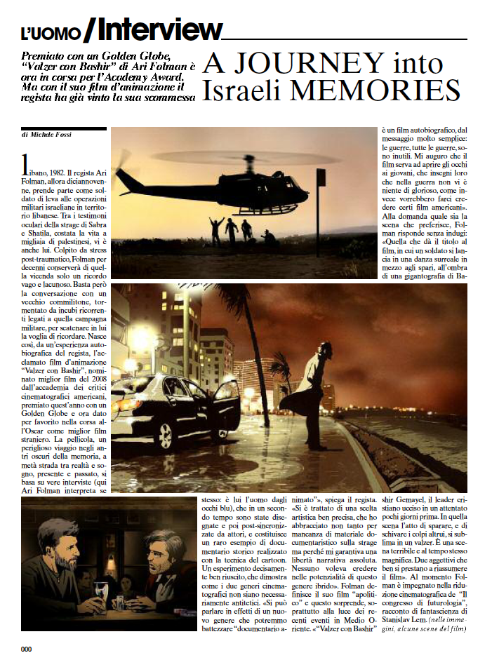 Libano, 1982. Il regista Ari Folman, allora diciannovenne, prende parte come soldato di leva alle operazioni militari Israeliane in territorio Libanese. Tra i testimoni oculari della strage di Sabra und Schatila, costata la vita a centinaia, forse migliaia palestinesi, perpetrata da milizie di Cristiani libanesi con la connivenza degli alti ranghi dell’esercito Israeliano, vi è anche lui. Colpito da stress post-traumatico, Folman per decenni conserverà di quella vicenda solo un ricordo vago e lacunoso. Basta però la conversazione con un vecchio commilitone, tormentato da incubi ricorrenti legati a quella campagna militare, per scatenare in lui la voglia di ricordare. Nasce così, da un’esperienza autobiografica del regista, l’acclamato fim d’animazione “Valzer con Bashir” – nominato miglior film del 2008 dall’accademia dei critici cinematografici americani, premiato quest’anno con un Golden Globe e ora dato per favorito nella corsa all’Oscar al miglior film straniero. Il film, un periglioso viaggio negli antri oscuri della memoria, a metà strada tra la realtà e sogno, presente e passato, si basa su delle vere interviste (Ari Folman interpreta se stesso nel film: il signore dagli occhi blu è lui), che in un secondo tempo sono state disegnate e poi post-sincronizzate da attori e costituisce un raro esempio di documentario storico realizzato con la tecnica del cartoon. Un esperimento decisamente ben riuscito, che dimostra come i due generi cinematografici non siano necessariamente antitetici. «Si tratta in effetti di nuovo genere, che potremmo battezzare documentario animato», spiega il regista israeliano. «Si è trattato di una scelta artistica ben precisa, chiara fin dall’inizio del progetto, che ho abbracciato non tanto per mancanza di materiale documentaristico sulla strage di Sabra und Schatila , ma perché mi garantiva libertà fabulatoria assoluta. Nessuno voleva credere nelle potenzialità di questo genere ibrido: quando ho presentato il progetto, a Toronto, 38 produttori su 40 mi hanno chiesto con scetticismo: perché usare un cartone animato per fare un documentario su una guerra?». Folman definisce il suo film “apolitico”, e questo sorprende, soprattutto alla luce dei recenti eventi in Medio Oriente. «In un film-documentario politico», spiega il regista «ci saremmo curati di dar voce a più punti di vista, intervistando dei Palestinesi, dei Cristiani. Ma non è il caso di Valzer con Bashir. È un film autobiografico, dal messaggio molto semplice : le guerre, tutte le guerre, sono inutili. Mi auguro che il film serva ad aprire gli occhi ai giovani, che insegni loro che nella guerra non vi è niente di glorioso, o addirittura glamour, come vorrebbero farci credere certi film americani. Se anche pochi di loro, dopo aver visto il film, proveranno repulsione per la guerra, avrò raggiunto il mio traguardo ». Alla domanda quale sia la scena che preferisce nel film, Folman risponde senza indugi : «Quella che dà il titolo al film, in cui un soldato si lancia in una danza surreale in mezzo agli spari, all’ombra di una gigantografia di Bashir Gemayel, il leader Cristiano ucciso in un attentato pochi giorni prima. In quella scena l’atto di sparare, e di schivare i colpi altrui, si sublima in un valzer. È una scena terribile e al tempo stesso magnifica. Due aggettivi che ben si prestano a riassumere il film». Al momento Folman è impegnato alla riduzione cinematografica de “Il congresso di futurologia”, il noto racconto di fantascienza di Stanislav Lem, nella quale scene animate si alterneranno a scene filmate.