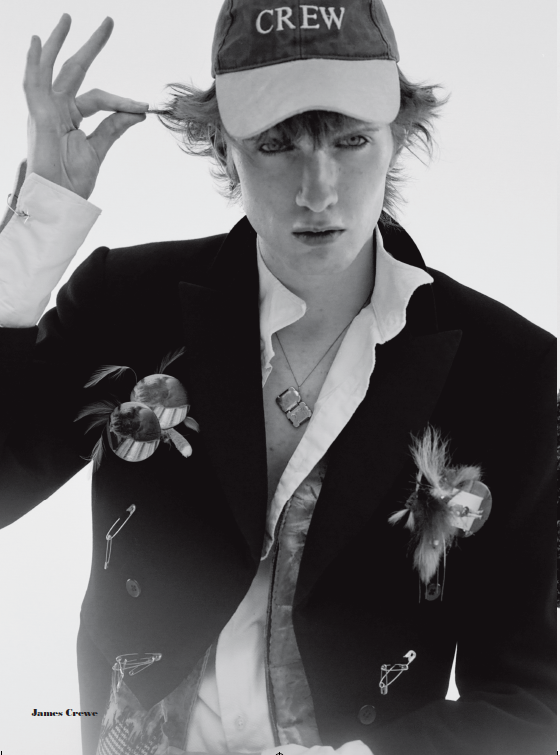 Laureato di fresco alla prestigiosa Central Saint Martins di Londra, l’eclettico James Crewe si descrive come uno cui piace realizzare monoprint, ballare, collezionare Balenciaga e Alexander Mac Queen, dipingersi la faccia, guardare un sacco di film, curare da bravo english man le piante del proprio giardino e, quando capita, fare il modello. La passione per la moda potrebbe inoltre portarlo presto — rivela il ventitreenne — ad iscriversi ad un corso per stilista di moda maschile. Senza mai dimenticare l’arte: “Ho visitato da poco il Fitzwilliam Museum in Cambridge , dove, insieme ad un curatore, mi sono perso tra i dipinti e le opere del tardo Medioevo e primo Rinascimento italiano. La stessa sera mi sono riguardato l’intera trilogia di Matrix. Ed adesso eccomi qua, a sognare spesso di notte di fondere tra loro questi due mondi lontani. Da artista, vorrei lavorare a degli ibridi in grado di dar forma a questo complesso sistema di ispirazione”.