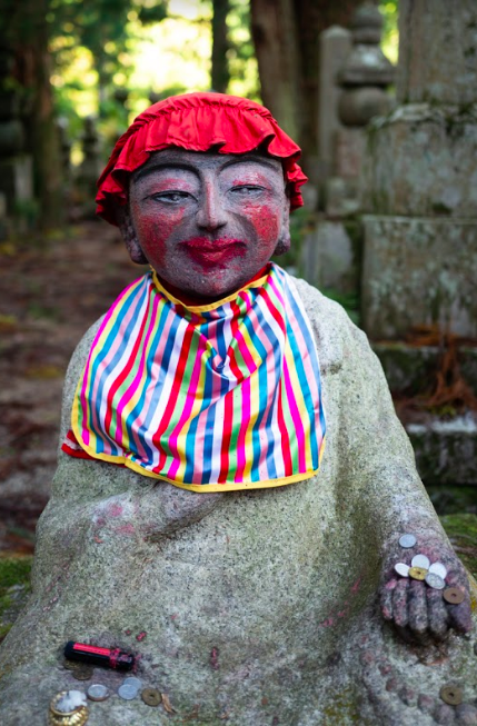 Si racconta che Kukai, il grande Maestro del buddismo giapponese, fondatore della corrente buddistica Shingon nel periodo Heian, fosse alla ricerca del luogo più adatto dove fondare un monastero della sua scuola in Giappone. Per individuarlo, decise di affidarsi alla magia del Vajra, un oggetto liturgico di metallo di forma allungata, caratterizzato dalla presenza, su entrambi i lati, di uno spunzone centrale e due acuminati uncini laterali, che nel buddismo esoterico è simbolo di saggezza. Ne lanciò uno dalla Cina alla volta del Giappone, pregando che il sacro oggetto, superando miracolosamente il lungo braccio di mare, gli indicasse il luogo prescelto. Le sue preghiere furono ascoltate: il Vajra precipitò sul fitto bosco del Monte Koya (Koyasan), impigliandosi sulla cima di un abete. Su queste verdissime montagne della provincia di Wakayama, a circa un’ora di viaggio da Osaka, sorge oggi uno dei maggiori centri spirituali del Giappone. Qualche turista di troppo, questo va detto, ma in compenso decine di templi da visitare e un bellissimo cimitero buddista venerato come il più sacro del paese. Se ne consiglia una visita durante una giornata di pioggia: i viottoli tra le tombe si svuotano magicamente di gran parte dei visitatori e l’immensa necropoli, complice qualche banco di nebbia che si leva dal terreno muschioso, torna ad essere un luogo intriso di spiritualità e mistero, che invita al silenzio.