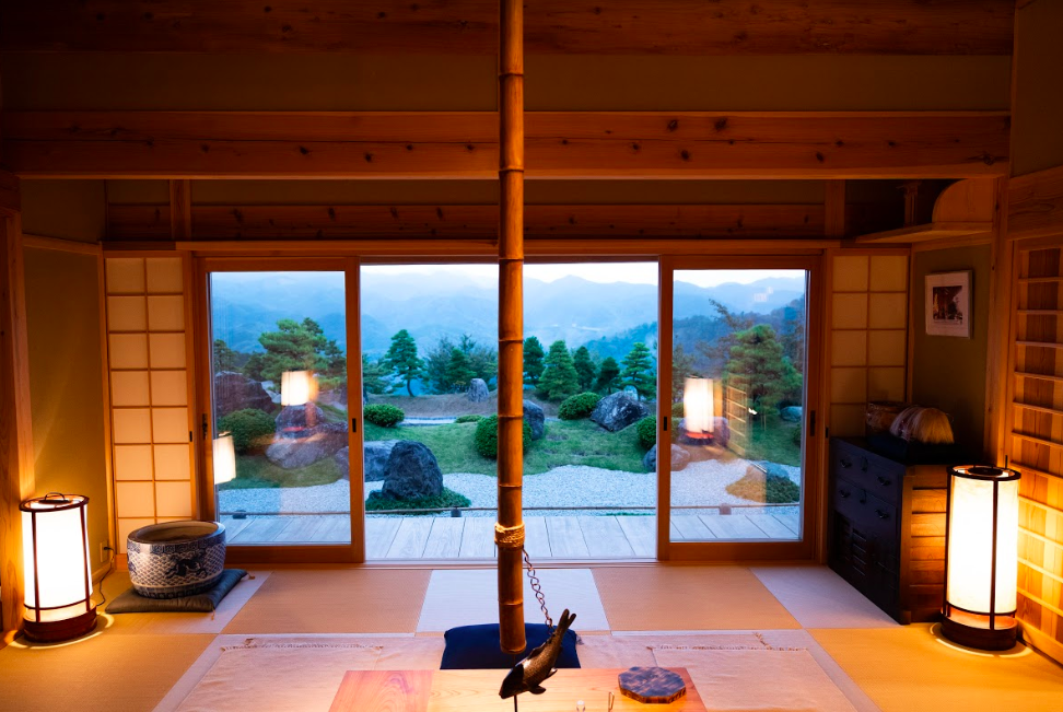 È un dolce risveglio quello che attende i visitatori di “Sasayuri Ann Ozunu”, una villa tradizionale giapponese spersa tra le colline coltivate a terrazza della provincia di Nabari, a circa un’ora di viaggio da Nara. All’alba, col primo canto degli uccelli, una luce eterea e diffusa prende gradualmente a filtrare dalla carta di riso che decora le pareti della stanza, invitando delicatamente ad aprire gli occhi. La prima cosa che si nota è l’inconfondibile odore degli interni tradizionali giapponesi: una rassicurante fragranza di legno frammisto all’odore della paglia dei tatami che rivestono il pavimento, che da solo basta, dopo pochi respiri, ad infondere un senso di pace. A corroborarlo, l’estetica essenziale dell’arredo, ridotto come vuole la tradizione nipponica al minimo indispensabile: un materasso futon, un armadio per nasconderlo durante il giorno, un braciere al centro della stanza, un vaso di fiori, il dipinto di un grande ideogramma a decorazione di una parete, e niente più. Forme pure, armonia e ricerca maniacale dell’equilibrio ci attendono, scostata la porta scorrevole che dà sulla terrazza, anche nel vasto giardino zen che circonda la villa. Un giardino “metafisico”, dove la Natura, eccezion fatta per la presenza di qualche bonsai, è evocata soprattutto per mezzo di simboli: le linee concentriche tracciate col rastrello nel ghiaino rappresentano le onde del mare; i pesanti macigni e le zolle di muschio che, qua e là, ne rompono la monotonia, simboleggiano invece scogli e verdissime isole. Altri macigni, ancora più grandi, simboleggiano le gobbe di un enorme drago marino che – ci piace credere sia vero — ha vegliato sul nostro sonno tutta la notte, tenendo a debita distanza gli spiriti cattivi.