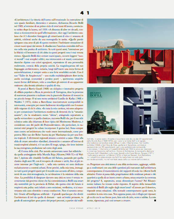 “L’architettura è la vittoria dell’Uomo sull’irrazionale: la costruzione di uno spazio familiare, domestico e umano”, dichiarò Ricardo Bofill nel 1989, al termine di un lungo ciclo di trent’anni di carriera. «A distanza di altre tre decadi, continuo a riconoscermi in questa affermazione», commenta l’architetto catalano, che quest’anno festeggia gli ottant’anni di vita e i sessanta di attività. «Spiega cosa amo di più del mio mestiere: l’inebriante sensazione di creare nuovi spazi dal niente. E ribadisce l’assoluta centralità dell’Uomo nella mia pratica di architetto. In tutti questi anni, la mia attenzione per la felicità ed il benessere di chi abita i miei progetti non è mai venuta meno». Quando Bofill parla di “creare nuovi spazi”, occorre leggere “nuovi mondi”: mai semplici edifici, ma microcosmi a se stanti; costruzioni titaniche dipinte con colori sgargianti, espressione di una personalità esuberante, pienamente conscia della propria unicità. La magniloquenza del suo linguaggio architettonico, tuttavia, lungi dall’essere una mera forma di auto-celebrazione, è sempre unita ad una forte sensibilità sociale.