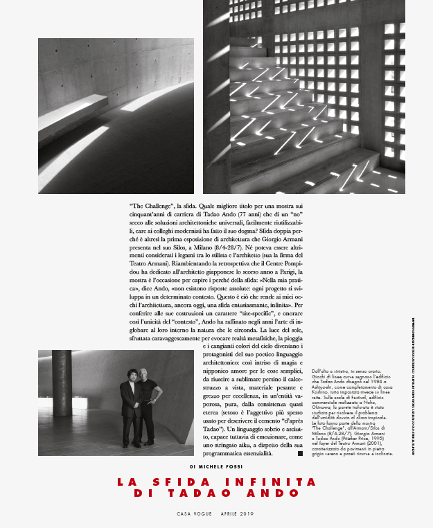“The Challenge”, la grande retrospettiva che il Centre Pompidou ha dedicato a Tadao Ando lo scorso anno a Parigi, arriva a Milano. La mostra, che si inaugura l’8 Aprile negli spazi di Armani/Silos, costituisce un’occasione irripetibile per ripercorrere le tappe dei cinquant’anni di carriera dell’architetto giapponese, dalla celebre “Tomishima House” del 1973, fino agli attesi progetti di prossima inaugurazione: due musei per l’isola di Naoshima e l’atteso restauro della “Bourse de Commerce” di Parigi commissionato da François Pinault. Il titolo della mostra allude alla determinazione con cui per mezzo secolo Ando ha ribadito il suo no secco a tutte quelle soluzioni architettoniche universali, facilmente riutilizzabili, care ai suoi colleghi modernisti. “Nella mia pratica non esistono risposte assolute: ogni progetto si sviluppa in un determinato contesto”, dichiara. “Questo è ciò che rende ai miei occhi l’architettura, ancora oggi, una sfida entusiasmante, infinita”. Per conferire alle sue costruzioni un carattere sito-specifico, e onorare così l’unicità del “contesto”, Ando raffina negli anni l’arte di inglobare al loro interno la Natura che le circonda. La luce del sole, sfruttata caravaggescamente per evocare realtà metafisiche, la pioggia ed i cangianti colori del cielo diventano così i protagonisti del suo poetico linguaggio architettonico: così intriso di magia e nipponico amore per le cose semplici, da riuscire a sublimare persino il cemento, materiale pesante e grezzo per eccellenza, in un’entità vaporosa, pura, dalla consistenza quasi eterea. Un linguaggio sobrio e asciutto, capace tuttavia di emozionare, come uno stringato aiku, a dispetto della sua programmatica essenzialità.