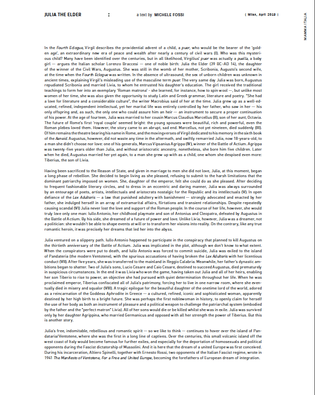 Julia ventured on a slippery path. Iullus Antonius happened to participate in the conspiracy that planned to kill Augustus on the thirtieth anniversary of the Battle of Actium. Julia was implicated in the plot, although we don’t know to what extent. When the conspirators were put to death, and Iullo Antonio was forced to commit suicide, Julia was exiled to the island of Pandateria (the modern Ventotene), with the spurious accusations of having broken the Lex Adulteris with her licentious conduct (VII). After five years, she was transferred to the mainland in Reggio Calabria. Meanwhile, her father’s dynastic ambitions began to shatter. Two of Julia’s sons, Lucio Cesare and Caio Cesare, destined to succeed Augustus, died prematurely in suspicious circumstances. In the end, it was Livia who won the game, having taken out Julia and all of her heirs, enabling her son Tiberio to rise to power, an objective she had pursued with quiet determination throughout her life. When he was proclaimed emperor, Tiberius confiscated all of Julia’s patrimony, forcing her to live in one narrow room, where she eventually died in misery and squalor (VIII). A tragic epilogue for the beautiful daughter of the one-time lord of the world adored as a reincarnation of the Goddess Aphrodite in Greece — a cultured, refined, iconic and sophisticated woman, apparently destined by her high birth to a bright future. She was perhaps the first noblewoman in history, to openly claim for herself the use of her body as both an instrument of pleasure and a political weapon to challenge the patriarchal system ( embodied by the father and the “perfect matron” Livia). All of her sons would die or be killed whilst she was in exile. Julia was survived only by her daughter Agrippina, who married Germanicus and opposed with all her strength the power of Tiberius. But this is another story.