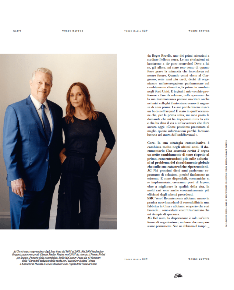 Al Gore è stato vicepresidente degli Stati Uniti dal 1993 al 2001. Nel 2006 ha fondato l’organizzazione no-profit Climate Reality Project e nel 2007 ha ricevuto il Premio Nobel per la pace. Pioniera della sostenibilità, Stella McCartney è una dei 43 firmatari della “Carta dell’industria della moda per l’azione per il clima” creata a Katowice in Polonia lo scorso dicembre sotto l’egida delle Nazioni Unite.