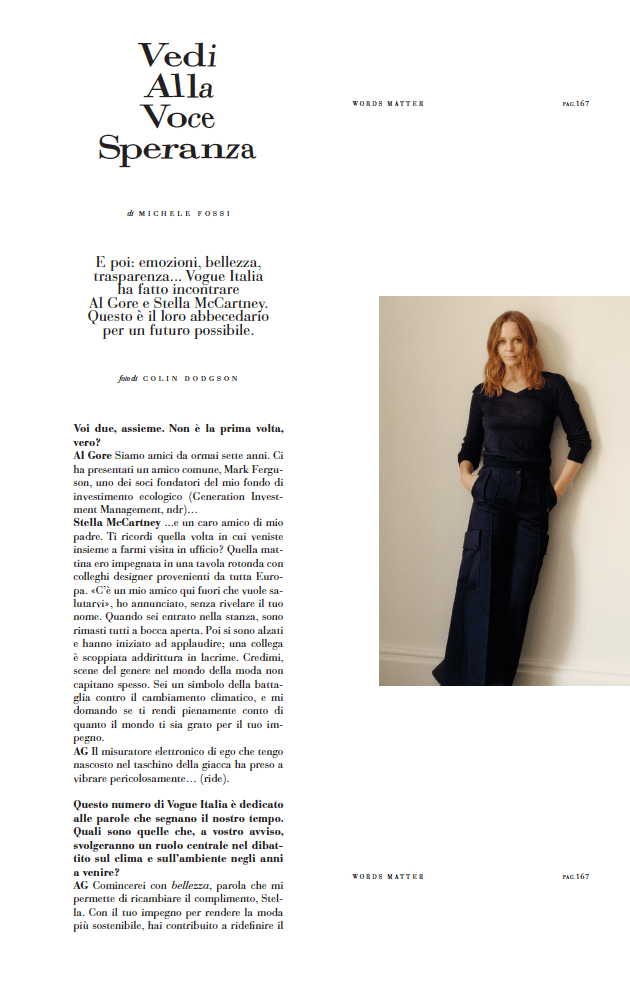E poi: emozioni, bellezza, trasparenza. Vogue Italia ha fatto incontrare Al Gore e Stella Mc Cartney. Questo è il loro abbecedario per un futuro possibile.