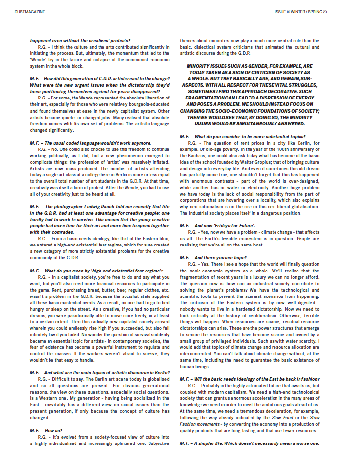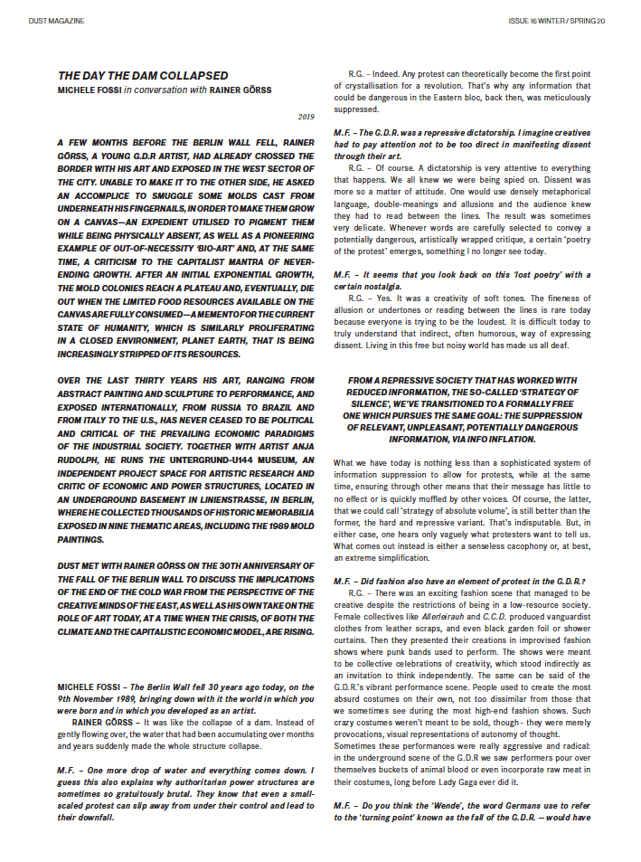 DUST MET WITH RAINER GÖRSS ON THE 30TH ANNIVERSARY OF THE FALL OF THE BERLIN WALL TO DISCUSS THE IMPLICATIONS OF THE END OF THE COLD WAR FROM THE PERSPECTIVE OF THE CREATIVE MINDS OF THE EAST, AS WELL AS HIS OWN TAKE ON THE ROLE OF ART TODAY, AT A TIME WHEN THE CRISIS, OF BOTH THE CLIMATE AND THE CAPITALISTIC ECONOMIC MODEL, ARE RISING.