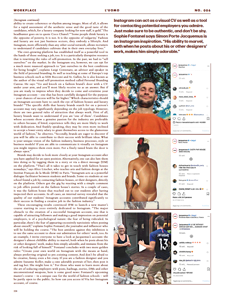 Instagram has become the go-to social network for fashion professionals because it is a powerful and efficient way to share one’s work, cultural references and skills. However, has it also evolved into a recruitment tool? Do luxury and fashion brands examine candidates’ Instagram accounts when they’re looking for new employees? “With all certainty!”, says Carola Adami, founder of Adami & Associati, one of Italy’s leading headhunter companies specialising in luxury and fashion. “Instagram’s peculiarity – of being a platform for sharing images – allows for a preliminary evaluation of the candidate’s cultural and visual references. It also reveals a number of important visual skills that cannot be quickly assessed via professional networking platforms like Linkedin, such as the ability to create coherence or rhythm among images. Most of all, it allows for a rapid assessment of the aesthetic sense and the good taste of the candidates, which, for a luxury company looking for new staff, is gold.” The headhunter goes on to quote Coco Chanel: “‘Some people think luxury is the opposite of poverty. It is not. It is the opposite of vulgarity.’ Fashion and luxury are not just business sectors, they embody a lifestyle. And Instagram, more efficiently than any other social network, allows recruiters to understand if candidates cultivate that in their own everyday lives.” The ever-growing platform has established itself as a powerful tool in the hands of those seeking a job, too. It is a particularly disruptive resource that is rewriting the rules of self-promotion. In the past, we had to “sell ourselves” on the market. In the Instagram era, however, we can opt for a much more nuanced approach to “put ourselves in the best conditions for being bought”, explains Luigi Centenaro, an advisor and speaker in the field of personal branding. As well as teaching at some of Europe’s top business schools such as SDA Bocconi and St. Gallen, he is also known as the author of the visual self-promotion method called Personal Branding Canvas. He says: “Go and knock on a fashion brand’s door with a CV under your arm, and you’ll most likely receive no as an answer. But if you are ready to impress when they decide to come and scrutinise your Instagram account – one that has been carefully designed for the purpose – your chances of success will be far higher.” Which characteristics should an Instagram account have to catch the eye of fashion houses and luxury brands? “The specific skills that luxury brands search for on a person’s account may vary significantly depending on the job typology. However, there are two general rules of attraction that always work. First of all, luxury brands want to understand if you are ‘one of them’. Candidates whose accounts show a genuine passion for the industry are preferable to others because, if hired, experience tells they are more likely to work with dedication. And frankly speaking, they may be even more inclined to accept a lower entry salary to grant themselves access to the glamorous world of fashion,” he observes. “Secondly, brands are eager to discover if you will be able to contribute to their success with brilliant ideas. What is your unique vision of the fashion industry, business processes, style or business models? If you are able to communicate it visually on Instagram you might impress them even more. For a finely tuned brain, the door is always open.” Brands may decide to look more closely at your Instagram account after you have applied for an open position. Alternatively, one can also lure them into doing so by tagging them in a story or via a direct message (DM) on the platform. “That’s all it takes to get in touch with fashion houses nowadays,” says Alice Litscher, who teaches arts and fashion design at the Institut Français de la Mode (IFM) in Paris. “Instagram acts as a powerful dialogue facilitator between students and brands. Some ex-students at our school found a job by contacting fashion houses, or their designers, directly on the platform. Others got the gig by reacting with a simple comment to job offers posted on the fashion house’s stories. In a couple of cases, it was the fashion house that reached out to our students after having inspected their accounts. In all cases, an internal survey revealed that the quality of our students’ Instagram accounts contributed significantly to their success in finding a creative job in the fashion industry.” These encouraging results convinced IFM to launch a new master’s course starting in 2020 entirely dedicated to Instagram. “The major obstacle to the creation of a successful Instagram account, one that is capable of attracting followers and making a good impression on potential employers, is of a psychological nature: the fear of being ridiculed. In particular, there’s the fear of appearing excessively narcissistic when posting about oneself,” explains Sophie Fontanel, the journalist and influencer who will be holding the course. “The best antidote against this inhibition is to use the same account to show our admiration for others’ work, too. As an example, I invite everyone to have a look at Jacquemus’s account: the designer’s almost childlike ability to marvel, both when he posts about his or other designers’ work, makes him simply adorable, and immune from the risk of looking full of himself.” Fontanel concludes with two more golden rules: “Create your own world on Instagram with the means at hand, always preferring original to pre-existing content. And don’t be afraid to be creative, funny, even a bit crazy. If you are a fashion designer and you admire Suzanne Koller, make a cute adorable portrait of her, then post it and tag her. She might love it.” For those who want to learn more about the art of seducing employers with posts, hashtags, stories, DMs and other unconventional weapons, here is some good 