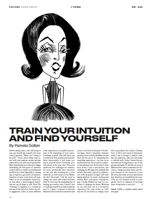 Pamela Golbin: Before asking what a job will bring to you, you should ask yourself a far more critical question: “What can I bring to the job?” If you cannot infuse your career with your passions, talents and past experiences, you will not be productive. More importantly, you will not be happy. Identifying the best parts of ourselves around which to build our professional profile is not trivial. Especially at a young age, it requires a good dose of intuition. Intuition, in turn, comes from self-trust, which is not an immutable characteristic, but rather a “psychological muscle” that we can all shape at will. How? By “training” it regularly, in a continuous process of trial and error. Hence my other suggestion: collect as many different work experiences as possible, particularly at the beginning of your career. Challenge yourself. This will allow you to build your first professional network. Most importantly, it will make you know yourself better, fortifying your self-esteem at the same time. The more ambitious the challenges we embrace, the more profoundly they transform us. Last year, after reaching the 25-year milestone as chief curator at the Musée des Arts Décoratifs, I felt the need to change my career path. Easier said than done. To overcome the paralysing fear of leaving my comfort zone, I knew I had to challenge myself in an unprecedented way. So I spent a semester at Harvard Business School and then moved for half a year to the holy mountains of Northern Japan, where I attended a Samurai training course held by Buddhist monks. Both turned out to be exhausting but rewarding experiences – the first on an intellectual level, the second on a physical and spiritual one. By the time I came back home, I was a new person, and changing my life trajectory suddenly felt natural. Recently, I started a collaboration with Jacquard, Google’s full-scale digital platform for smart clothing and textiles. After years spent curating the past, I finally fulfilled my wish to contribute to shaping the future. Working on our self-trust can be a revelatory experience. You may realise, as I did, that not all our drives to change come from a good place. As a Franco-Chilean born in Peru and raised in Venezuela, when I was a teenager I wished I had, like my classmates, only one nationality to identify with. Today, I know that my international background is one of my greatest strengths. To feel like we are not different from others, sometimes we decide to change precisely those uncommon features of our character, or our life story, that make us more special and that, therefore, we should keep the most. They are the sharpest arrows in your quiver. Don’t be ashamed of shooting them: bring them to your job.