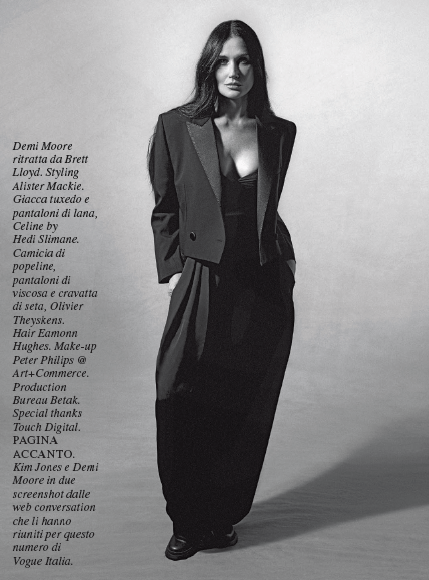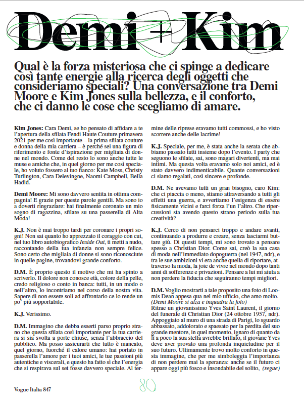 Kim Jones: Cara Demi, se ho pensato di affidare a te l’apertura della sfilata Fendi Haute Couture primavera 2021 per me così importante — la prima sfilata couture e donna della mia carriera — è perché sei una figura di riferimento e fonte d’ispirazione per migliaia di donne nel mondo. Come del resto lo sono anche tutte le muse e amiche che, in questo giorno per me così speciale, ho voluto fossero al tuo fianco: Kate Moss, Christy Turlington, Cara Delevingne, Naomi Campbell e Bella Hadid.