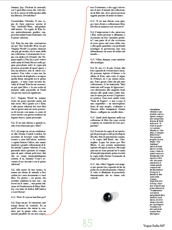 Sammy Jay è un esperto di libri rari. Ha curato una mostra di volumi antichi e manoscritti del Bloomsbury Group per il debutto di Kim Jones nella Couture Fendi P/E 2021 a Parigi. Dopo aver scoperto una prima edizione di “Frankenstein” con dedica autografa di Mary Shelley a Lord Byron, nel 2012 inizia a lavorare per il prestigioso rivenditore di libri antichi di Londra Peter Harrington.