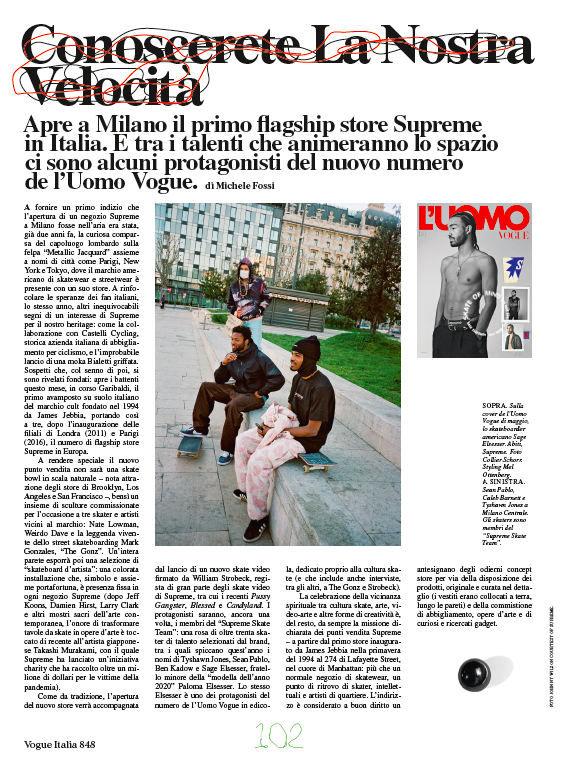 Come da tradizione, l’apertura del nuovo store verrà accompagnata dal lancio di un nuovo skate video firmato da William Strobeck, regista di gran parte degli skate video di Supreme, tra cui i recenti Pussy Gangster, Blessed e Candyland. I protagonisti saranno, ancora una volta, i membri del “Supreme skate team”: una rosa di oltre trenta skater di talento selezionati dal brand, tra i quali spiccano quest’anno i nomi di Tyshawn Jones, Sean Pablo, Ben Kadow e Sage Elsesser, fratello minore della “modella dell’anno 2020” Paloma Elsesser. Lo stesso Elsesser è uno dei protagonisti del numero de l’Uomo Vogue in edicola, dedicato proprio alla cultura skate (e che include anche interviste, tra gli altri, a The Gonz e Strobeck).