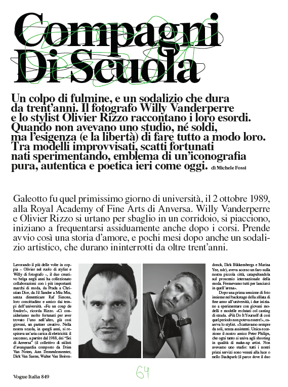 Galeotto fu quel primissimo giorno di università, il 2 ottobre 1989, alla Royal Academy of Fine Arts di Anversa. Willy Vanderperre e Olivier Rizzo si urtano per sbaglio in un corridoio, si piacciono, iniziano a frequentarsi assiduamente anche dopo i corsi. Prende avvio così una storia d’amore, e pochi mesi dopo anche un sodalizio artistico, che durano ininterrotti da oltre trent’anni. Lavorando il più delle volte in coppia – Olivier nel ruolo di stylist e Willy di fotografo –, il duo creativo belga negli anni ha collezionato collaborazioni con i più importanti marchi di moda, da Prada a Christian Dior, da Jil Sander a Miu Miu, senza dimenticare Raf Simons, loro concittadino e amico dai tempi dell’università. «Fu un coup de foudre!», ricorda Rizzo. «Ci consideriamo molto fortunati per aver trovato l’uno nell’altro, già così giovani, un partner creativo. Nella nostra scuola, in quegli anni, si respirava un’aria carica di elettricità: il successo, a partire dal 1988, dei “Sei di Anversa” (il collettivo di stilisti d’avanguardia composto da Dries Van Noten, Ann Demeulemeester, Dirk Van Saene, Walter Van Beirendonck, Dirk Bikkembergs e Marina Yee, ndr), aveva acceso un faro sulla nostra piccola città, catapultandola sul proscenio internazionale della moda. Fremevamo tutti per lanciarci in quell’arena».