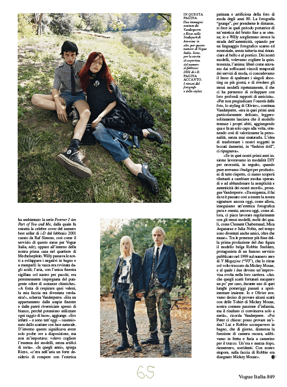 Dopo una prima sessione di foto insieme nel backstage della sfilata di fine anno all’università, i due iniziano a sperimentare con giovani modelli e modelle reclutati col casting di strada. «Più do-it-yourself di così quel periodo non poteva essere!», osserva lo stylist. «Scattavamo sempre da soli, senza assistenti. Unica eccezione il nostro amico Peter Philips, che ogni tanto si univa agli shooting in qualità di make-up artist. Non avevamo uno studio: tutti i nostri primi servizi sono venuti alla luce o nello Stadspark (il parco dove il duo ha ambientato la serie Forever I Am part of You and Me, dalla quale fu estratta la celebre cover del numero bestseller di iD del febbraio 2001 curato da Raf Simons, così come il servizio di questo mese per Vogue Italia, ndr), oppure all’interno della nostra prima casa nel quartiere di Mechelseplein. Willy passava le notti a sviluppare i negativi in bagno e a stamparli: la vasca era rovinata dagli acidi; l’aria, con l’unica finestra sigillata col nastro per pacchi, era perennemente impregnata del pungente odore di sostanze chimiche». «A forza di respirare quei veleni, la mia faccia era diventata verdastra!», scherza Vanderperre. «Era un appartamento dalle ampie finestre e dalle pareti riverniciate spesso di bianco, perché potessimo utilizzare ogni raggio di luce», aggiunge. «Ero infatti – e sono tutt’oggi – ossessionato dallo scattare con luce naturale. D’inverno questo significava avere solo poche ore a disposizione, ma non m’importava: volevo cogliere l’essenza dei modelli, senza artifici di sorta». «In quegli anni», spiega Rizzo, «c’era nell’aria un forte desiderio di rompere con l’estetica patinata ed artificiosa della foto di moda degli anni ’80. La fotografia “grunge”, per prenderne le distanze, si fece in quel periodo portatrice di un’estetica del brutto fine a se stessa; io e Willy scegliemmo invece la strada dell’autenticità, optando per un linguaggio fotografico scarno ed essenziale, senza tuttavia mai rinunciare al bello e al poetico. Dei nostri modelli, volevamo cogliere la quintessenza, l’anima: liberi come eravamo dai soffocanti vincoli temporali dei servizi di moda, ci concedevamo il lusso di spalmare i singoli shooting su più giorni, e di rivedere gli stessi modelli ripetutamente, il che ci ha permesso di sviluppare con loro profondi rapporti di amicizia». «Per non pregiudicare l’onestà delle foto, lo styling di Olivier», continua Vanderperre, «era in quei primi anni particolarmente delicato, leggero: solitamente lasciava che il modello tenesse i propri abiti, aggiungendo qua e là un solo capo alla volta, ottenendo così di valorizzarne la personalità, senza mai snaturarla. L’idea di trasformare i nostri soggetti in leccati damerini, in “fashion doll”, ci ripugnava».