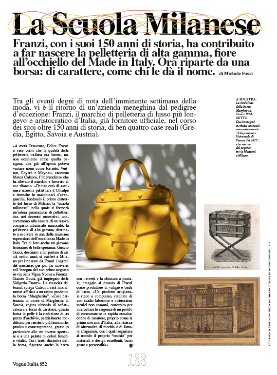 «A metà Ottocento, Felice Franzi si rese conto che la qualità della pelletteria italiana era buona, ma non eccellente come quella parigina, che già all’epoca poteva vantare nomi come Hermès, Vuitton, Goyard e Moynat», racconta Marco Calzoni, l’imprenditore che ha rilevato il marchio e lavorato al suo rilancio. «Decise così di assumere maestri pellettieri d’Oltralpe e investire in macchinari d’avanguardia, fondando il primo distretto del lusso di Milano: la “scuola milanese”, nella quale si formerà un’intera generazione di pellettieri che, nei decenni successivi, concorreranno alla nascita di un nuovo comparto industriale nazionale, la pelletteria di alta gamma, destinato a evolvere in una delle massime espressioni dell’eccellenza Made in Italy. Tra di loro anche un giovane fiorentino di belle speranze, Guccio Gucci, destinato a far parlare di sé: «A sedici anni, si trasferì a Milano per imparare da Franzi i segreti del mestiere; per poi far scrivere, sull’insegna del suo primo negozio in via della Vigna Nuova a Firenze: Guccio Gucci, già impiegato della Valigeria Franzi». La rinascita del brand, spiega Calzoni, sarà inizialmente affidata a un unico prodotto: la borsa “Margherita”. «Così battezzata in onore di Margherita di Savoia, regina simbolo di sofisticatezza e forza di carattere, questa borsa in pelle è la riedizione di un pezzo d’archivio, parzialmente modificato per renderlo più femminile, pratico e contemporaneo, grazie in particolare alle tre diverse aperture e a una palette di colori freschi e vitali». Tra i tratti distintivi della borsa, figurano anche la barra con i rivetti e la chiusura a puntale, omaggio al passato di Franzi come produttore di valigie e bauli di lusso. «Un prodotto artigianale ricco e complesso, risultato di uno studio laborioso e virtuosismi tecnici non comuni, concepito per intercettare le esigenze di un profilo di consumatrice in rapida crescita: donne di carattere, proprio come la prima sovrana d’Italia, alla ricerca di alternative di nicchia e di fattura artigianale, con i quali segnalare al mondo il proprio “occhio” per materiali e design eccellenti, buon gusto e personalità».