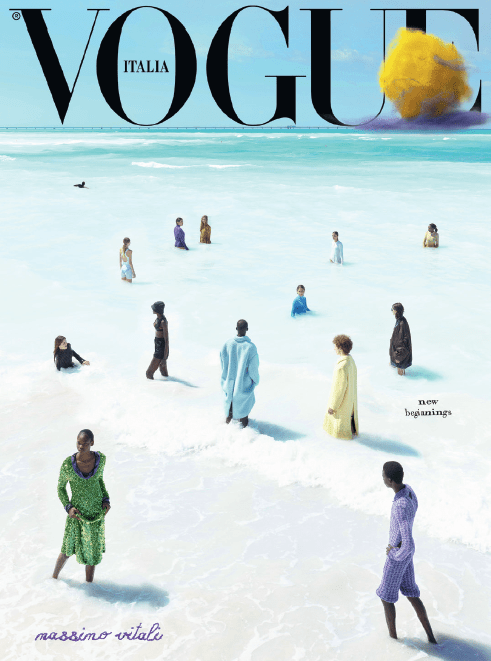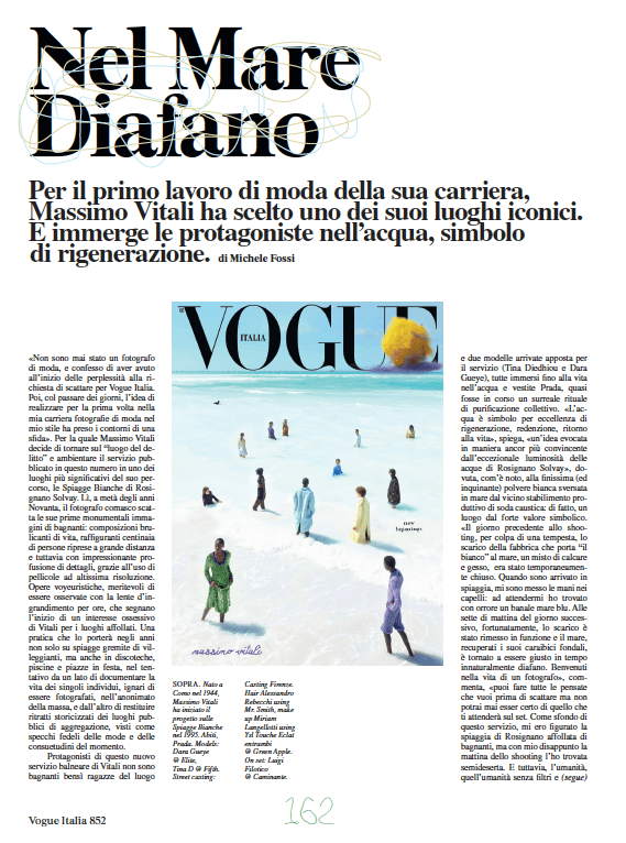 Protagonisti di questo nuovo servizio balneare di Vitali non sono bagnanti bensì ragazze del luogo e due modelle arrivate apposta per il servizio (Tina Diedhiou e Dara Gueye), tutte immersi fino alla vita nell’acqua e vestite Prada, quasi fosse in corso un surreale rituale di purificazione collettivo. «L’acqua è simbolo per eccellenza di rigenerazione, redenzione, ritorno alla vita», spiega, «un’idea evocata in maniera ancor più convincente dall’eccezionale luminosità delle acque di Rosignano Solvay», dovuta, com’è noto, alla finissima (ed inquinante) polvere bianca sversata in mare dal vicino stabilimento produttivo di soda caustica: di fatto, un luogo dal forte valore simbolico. «Il giorno precedente allo shooting, per colpa di una tempesta, lo scarico della fabbrica che porta “il bianco” al mare, un misto di calcare e gesso, era stato temporaneamente chiuso. Quando sono arrivato in spiaggia, mi sono messo le mani nei capelli: ad attendermi ho trovato con orrore un banale mare blu. Alle sette di mattina del giorno successivo, fortunatamente, lo scarico è stato rimesso in funzione e il mare, recuperati i suoi caraibici fondali, è tornato a essere giusto in tempo innaturalmente diafano. Benvenuti nella vita di un fotografo», commenta, «puoi fare tutte le pensate che vuoi prima di scattare ma non potrai mai esser certo di quello che ti attenderà sul set. Come sfondo di questo servizio, mi ero figurato la spiaggia di Rosignano affollata di bagnanti, ma con mio disappunto la mattina dello shooting l’ho trovata semideserta. E tuttavia, l’umanità, quell’umanità senza filtri e inibizioni che sempre cerco di ritrarre nelle mie foto, non è mancata. Sul set si sono presto venuti a creare piccoli malumori, rivalità, epifanie. A un certo punto una modella, perso l’equilibrio, è caduta nell’acqua vestita, suscitando l’ilarità generale. E così, per quanto freddo e asettico fosse il setting del servizio che avevamo in mente, con il bianco della sabbia come sfondo e la composizione studiata e rigida, la macchina fotografica ha finito col registrare, ancora una volta, la vita».