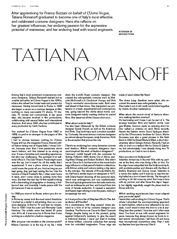 After apprenticing for Franca Sozzani on behalf of L’Uomo Vogue, Tatiana Romanoff graduated to become one of Italy’s most effective and celebrated costume designers. Here she reflects on her greatest influences, her enduring passion for the expressive potential of menswear, and her enduring beef with sound engineers.