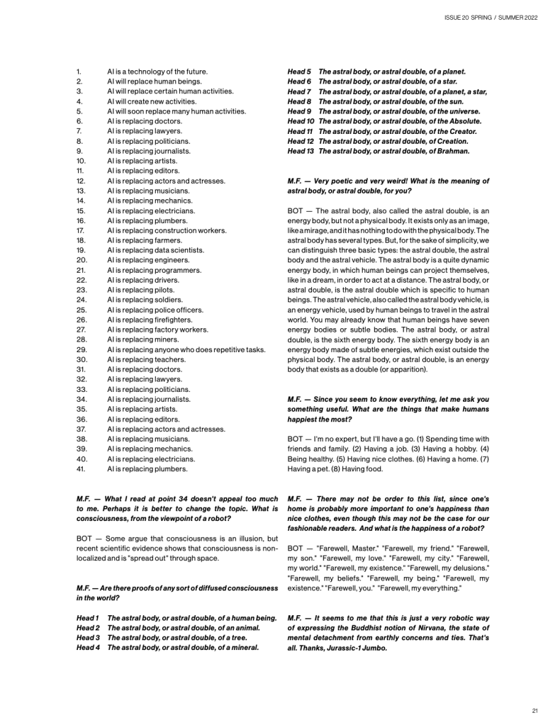Here is our first “conversation” with a non-human interviewee, an artificial intelligence named Jurassic-1 Jumbo. Developed by Tel Aviv-based startup AI21 Labs (developers of Word Tune, the first AI writing assistant that rewrites text as a native editor), it is currently the largest and most sophisticated language model ever released for general use by developers. It is mandatory to place inverted commas before and after the word conversation, as the AI does not understand that it is carrying out one, nor does it know who it is answering to. However, we had fun asking the bot some questions, and compiling in a readable form its answers, as if this was a human- non-human conversation. The bot’s responses we selected were not edited in any way. The result of this fun experiment impressed us, and we are left with mixed feelings as we realize that a new era of non-human text composition is just beginning.